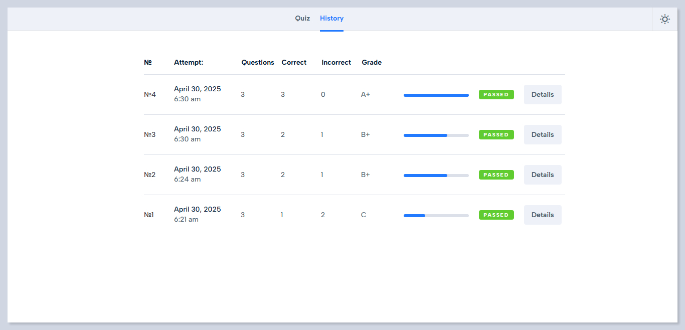 By clicking on the **Details** button, a brief attempt history can be checked.