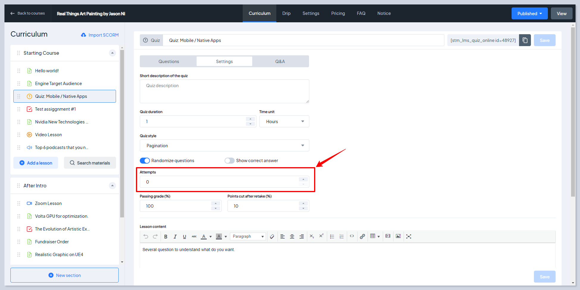 You can choose limited or unlimited attempts for students to retake quizzes if they cannot earn the required score or are not satisfied with the results. If the **Limited** option is selected **Attempts field** will appear in the Quiz Settings, where you have to indicate the number of attempts: