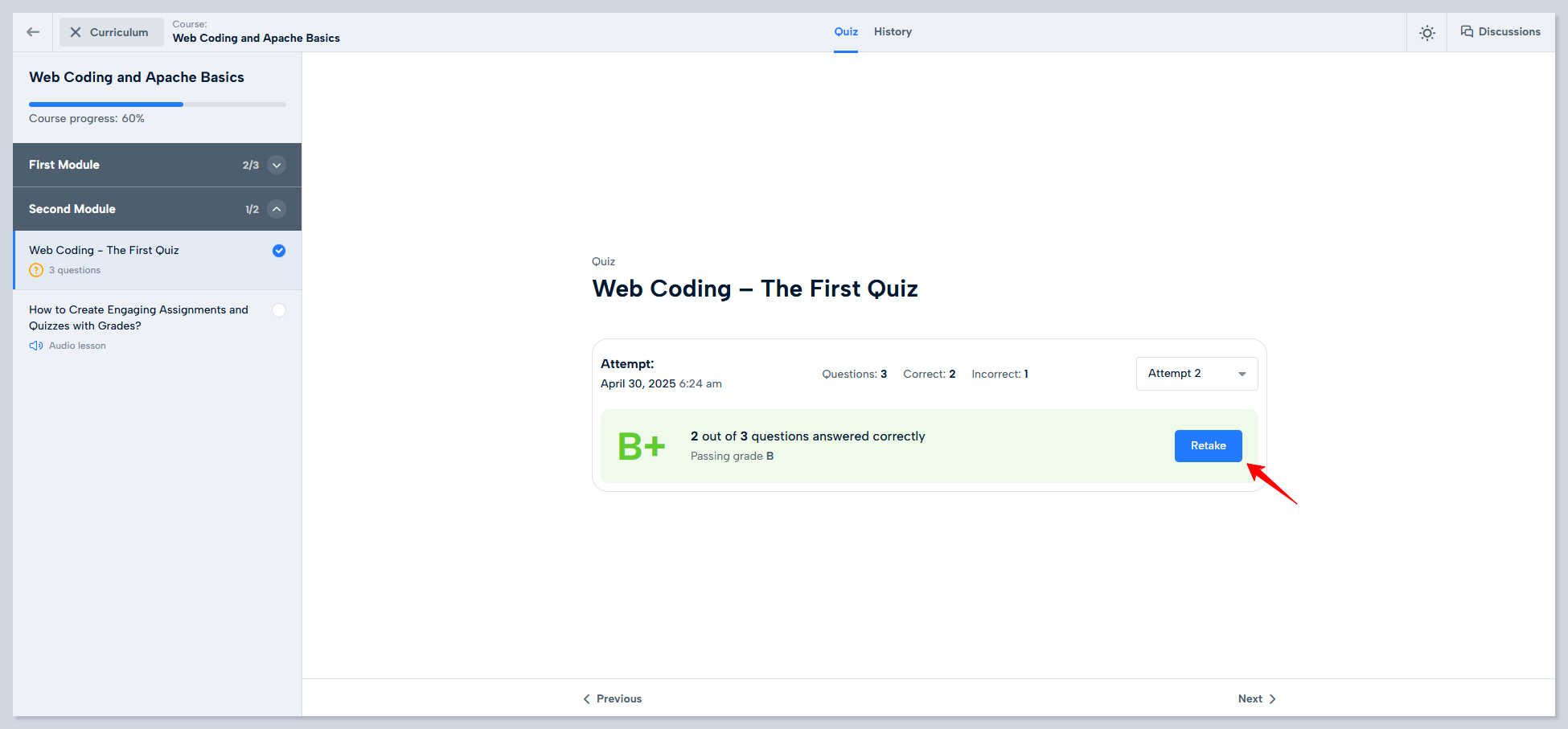 {% tab title="Retake After Passsing is ENABLED" %}
