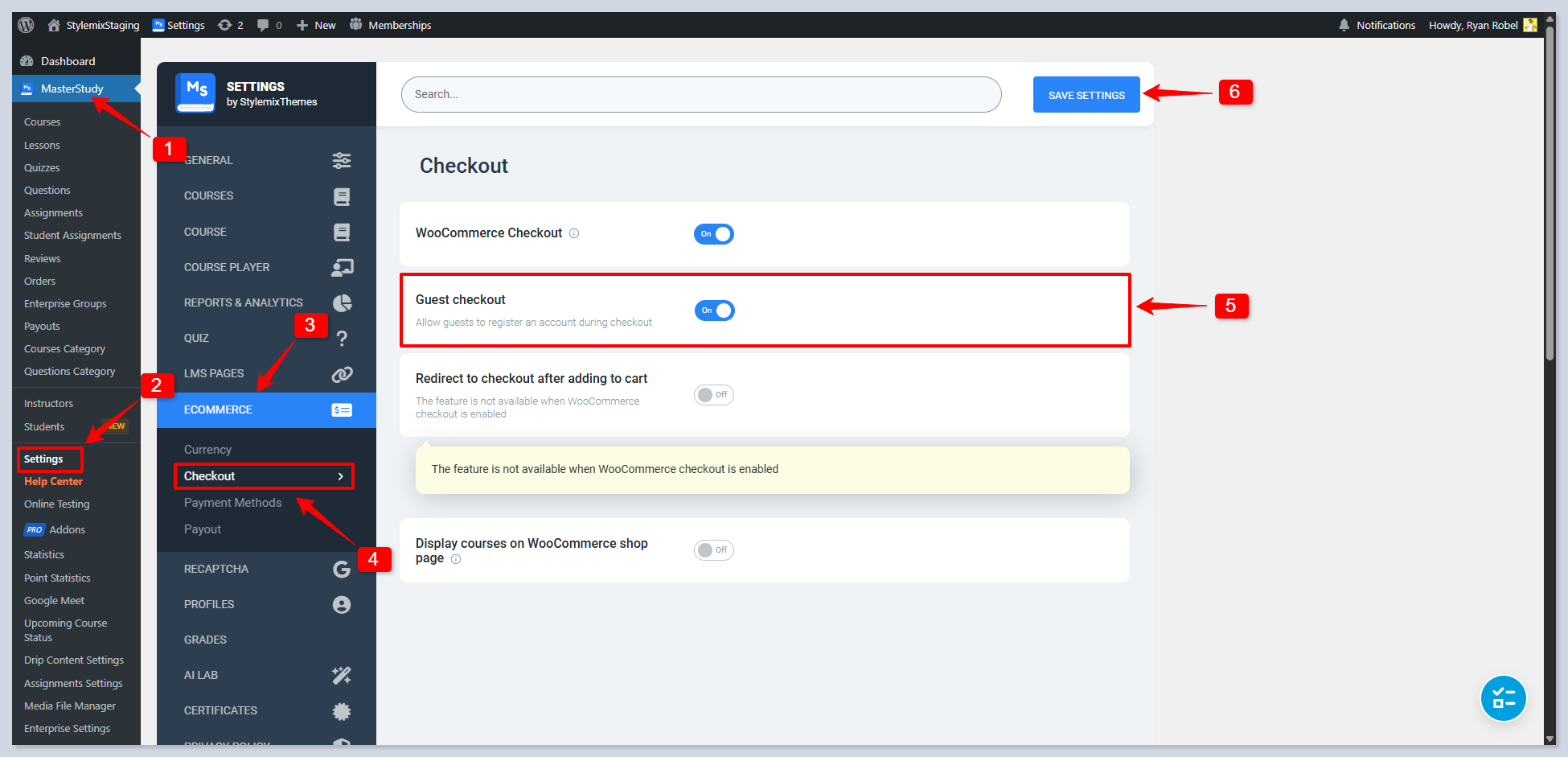 Now, you have to enable the Guest Checkout option from MS LMS settings as well. Follow **WP Dashboard > MS LMS > Settings > eCommerce > Checkout**, enable the **Guest Checkout**, and save the changes: