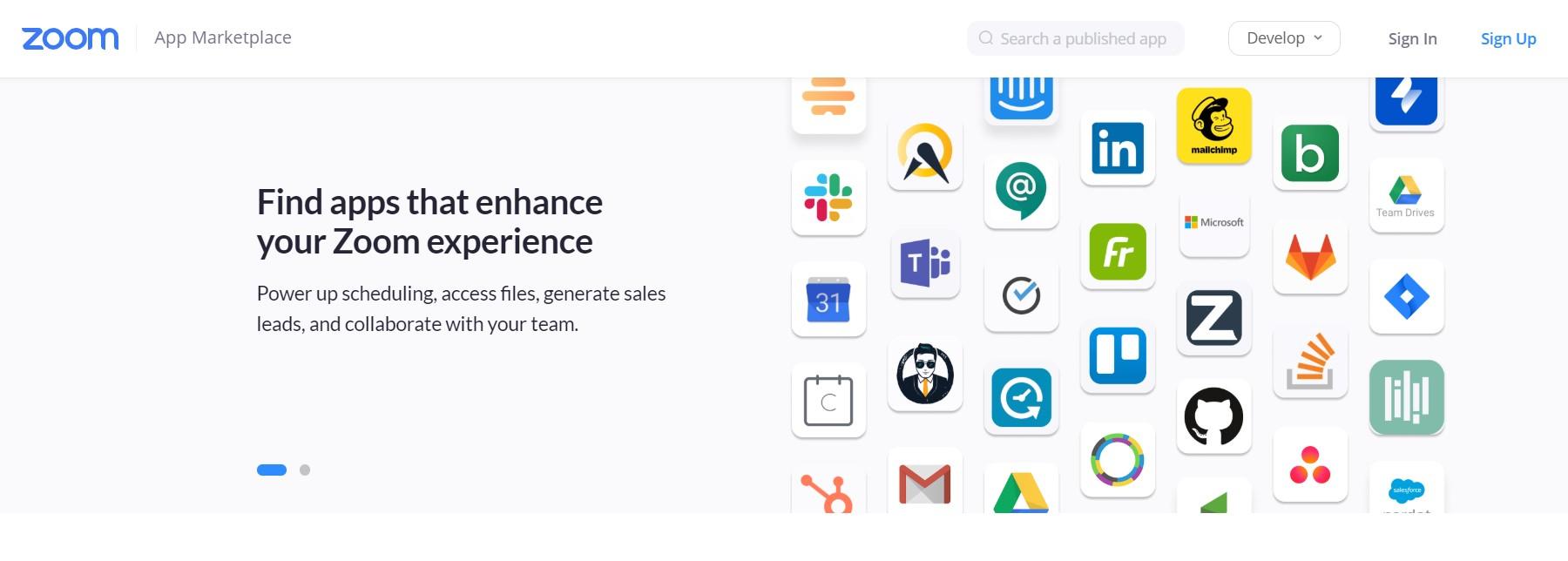On the Zoom App Marketplace page click on the Develop button and from the dropdown menu select the option Build App.