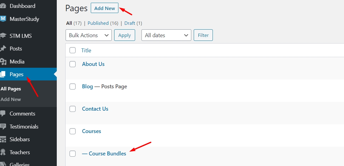 You also can manage the page’s display settings. Go to Pages from the dashboard menu. Find there a Course Bundle Page, or create a new one.