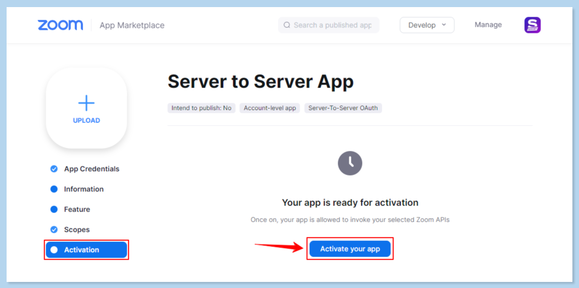 Among available Apps select **Server-to-Server** OAuth type and click **Create** to generate **API**s.