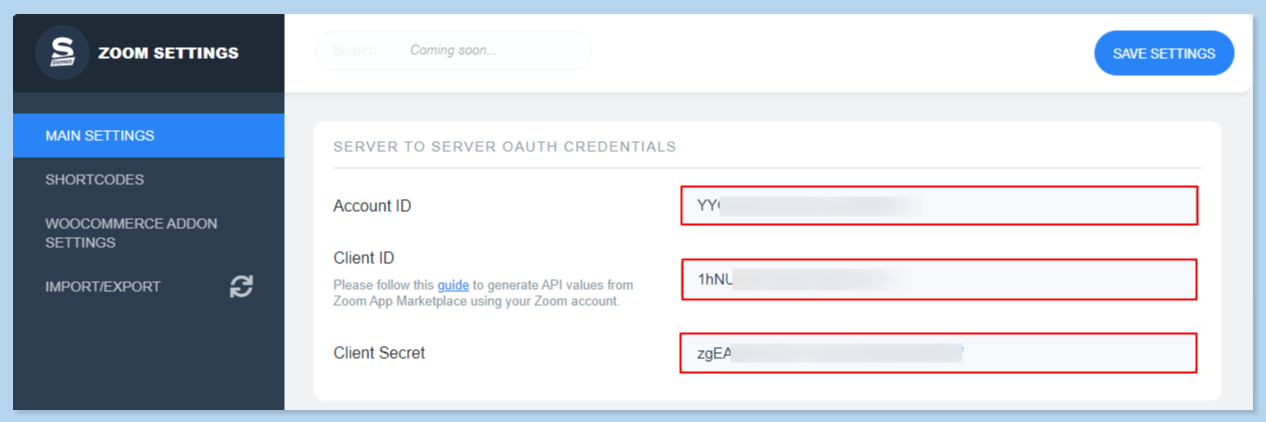 Copy the **Account ID, Client ID,** and **Client Secret** and paste them into the respective fields on the **Zoom Settings** page in your dashboard: