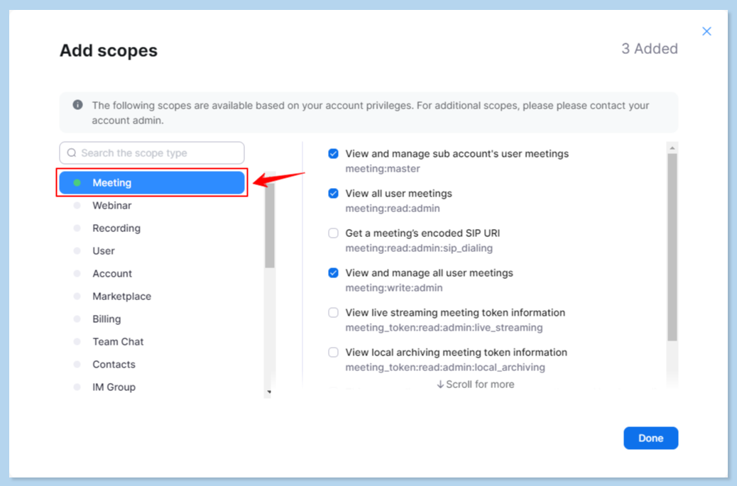 <figure><img src="https://691205473-files.gitbook.io/~/files/v0/b/gitbook-x-prod.appspot.com/o/spaces%2F-MDTL6WUldKvxQaP8jzz%2Fuploads%2FUhaggxz3xXzK22qCMFQN%2FeRoom%20-%20Server2server%20scopes%20meeting.png?alt=media&#x26;token=32c7e39b-f5e8-42b7-9fa9-cd2ff9b82203" alt=""><figcaption></figcaption></figure>