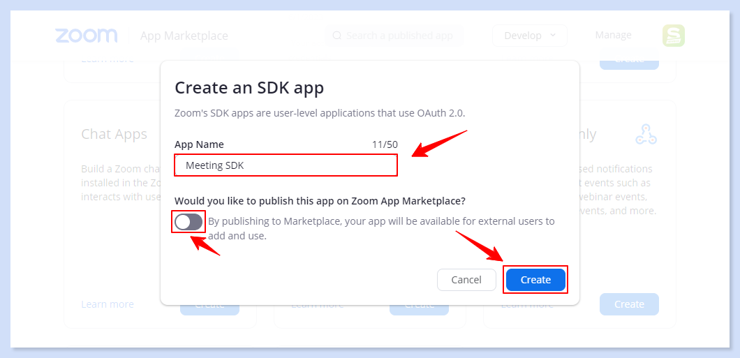The toggle button should be disabled in the "Would you like to publish this app on Zoom Marketplace" section.