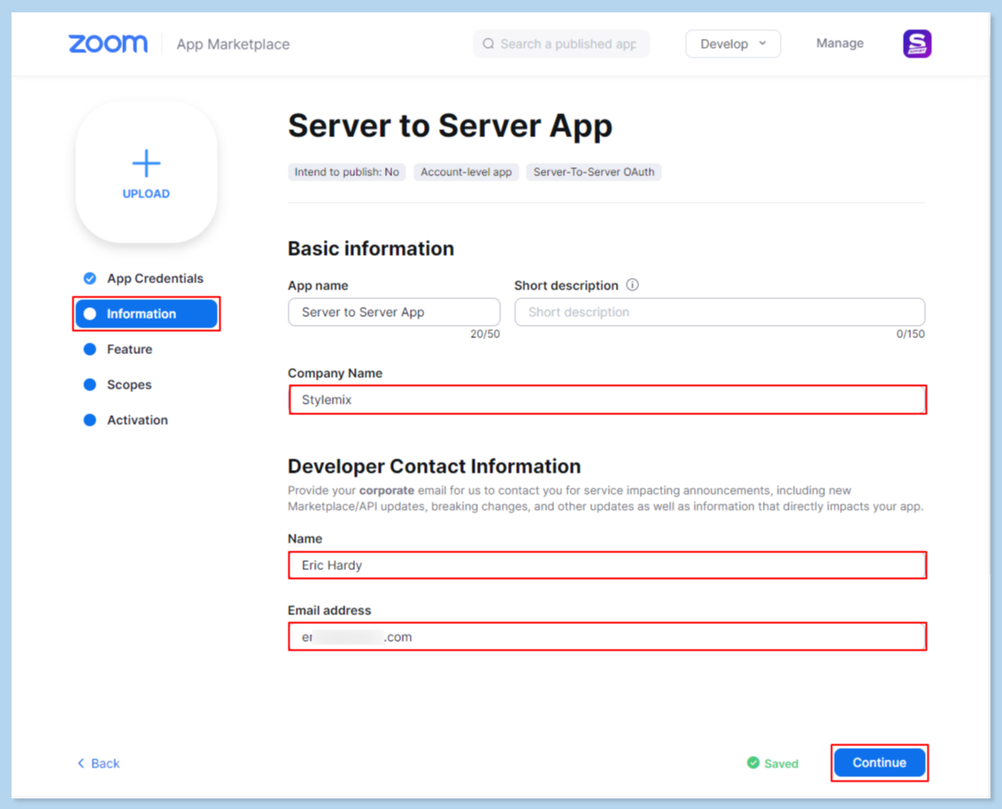 Then, it is required to add information for the app such as email, and description in the **Information** section. In the Information section, it is required to fill out the following fields:&#x20;