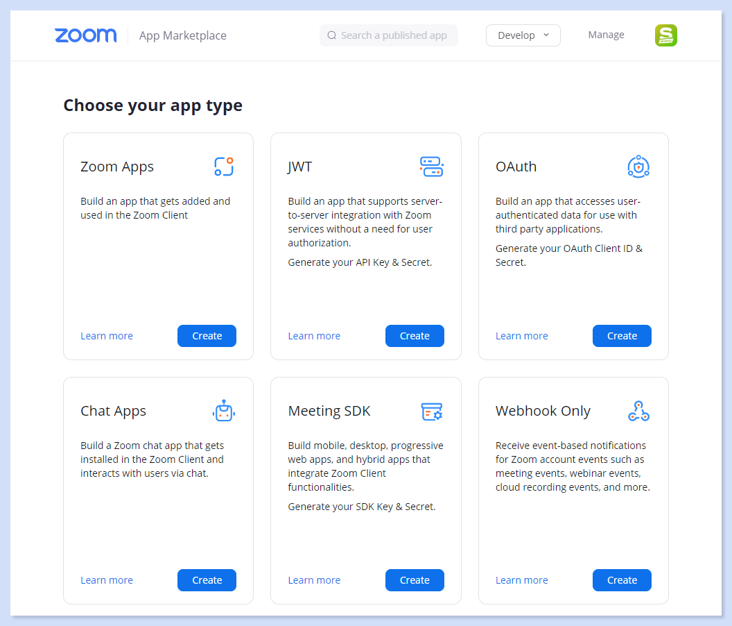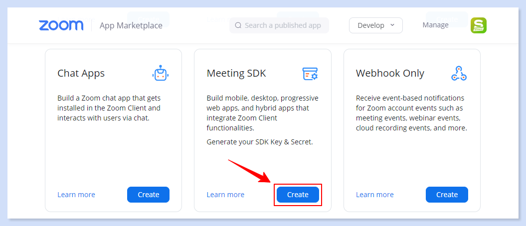 On the **Zoom App Marketplace** page click on the **Develop** button and from the dropdown menu select the option **Build App.**