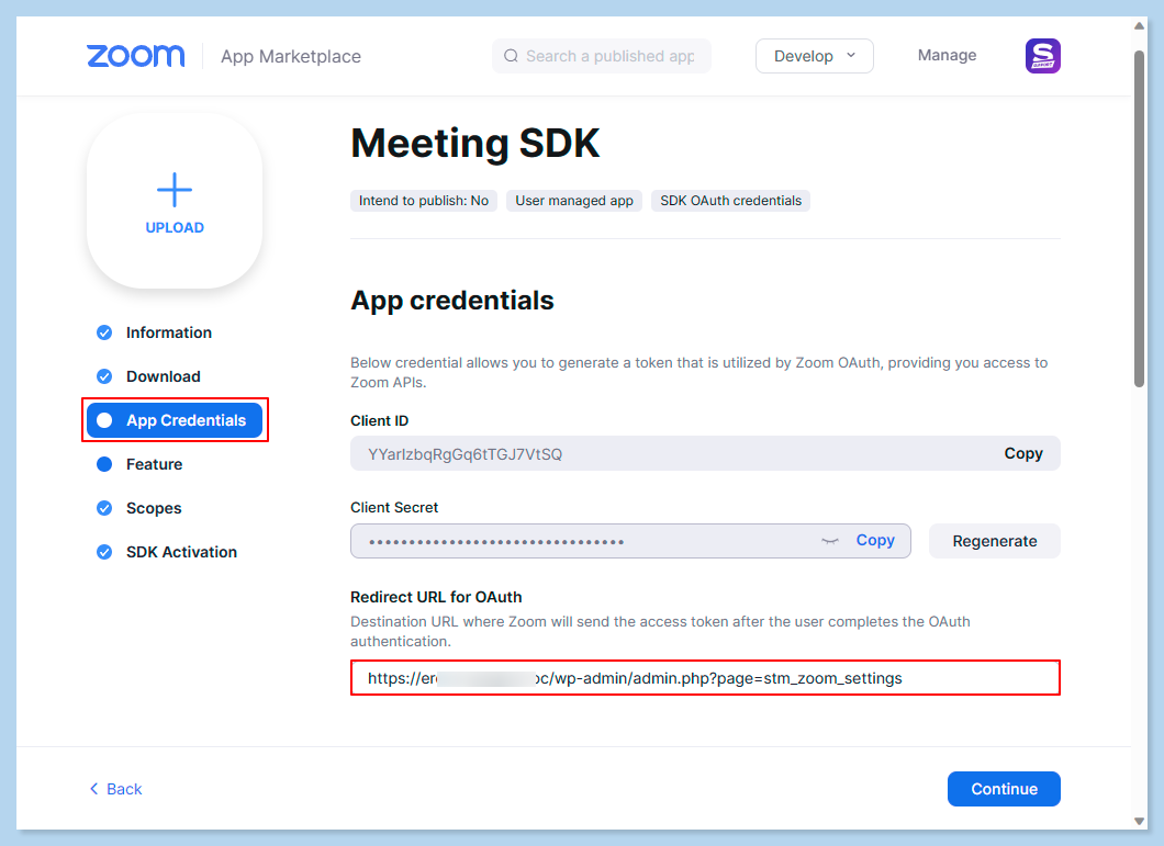 You will be required to enter some credentials: JWT API and Meeting SDK APIs. You can collect these credentials on **Zoom App Marketplace**. To collect credentials, follow **Zoom App Marketplace**: <https://marketplace.zoom.us/> and login into your existing Zoom account. If a Zoom account does not exist, it should be created using this [link](https://zoom.us/signup#/signup).
