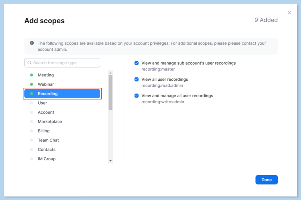 <figure><img src="https://691205473-files.gitbook.io/~/files/v0/b/gitbook-x-prod.appspot.com/o/spaces%2F-MDTL6WUldKvxQaP8jzz%2Fuploads%2Fx7i5wTv6tOJXMHDThAs3%2FeRoom%20-%20Server2server%20scopes%20recording.png?alt=media&#x26;token=10d51ab7-f58d-4c68-a463-663ab1d611cb" alt=""><figcaption></figcaption></figure>