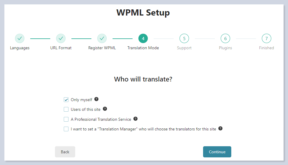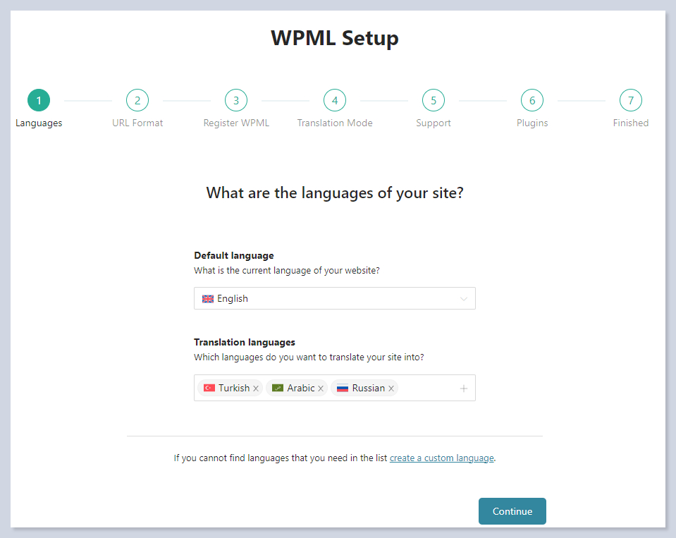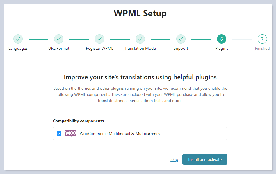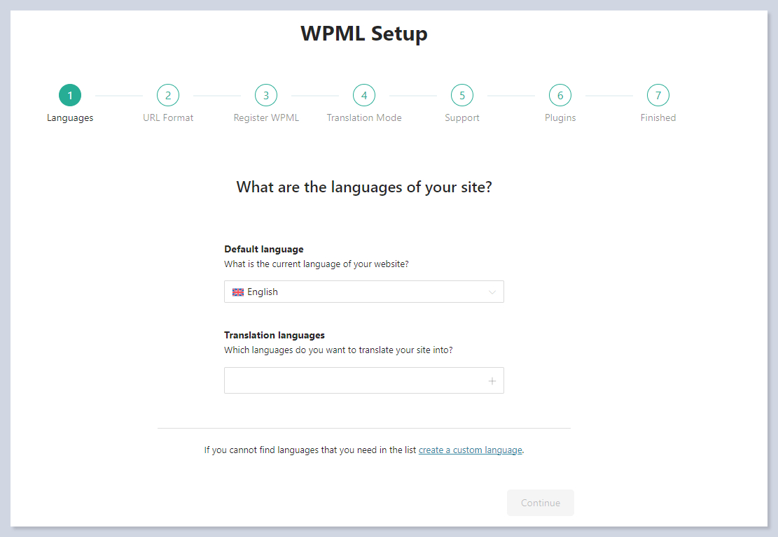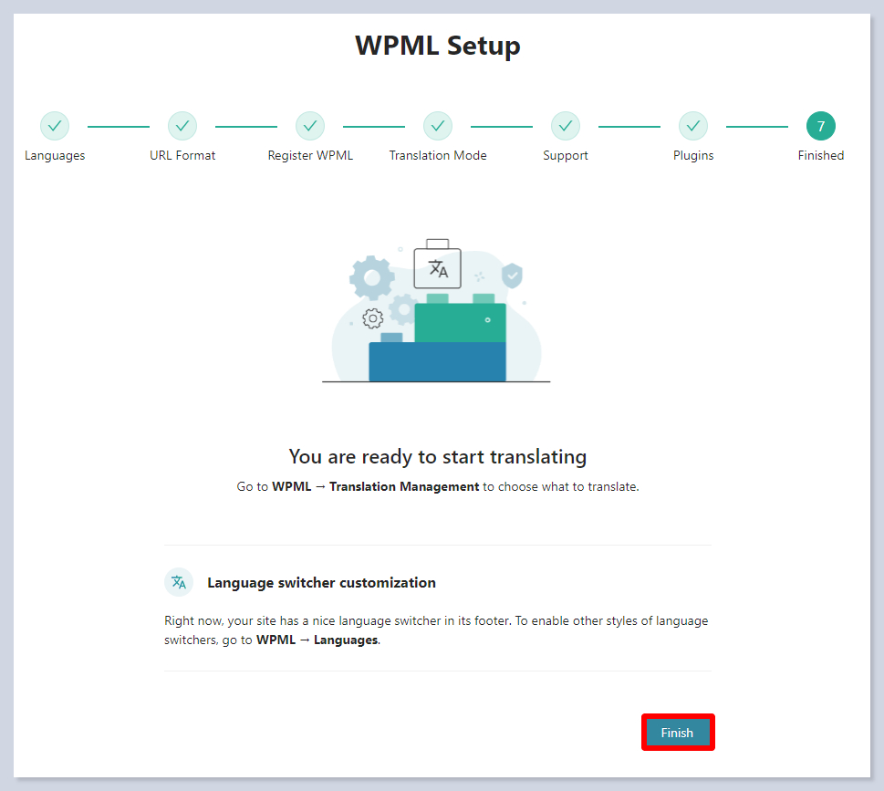 In the seventh step, wait a little bit till WPML is set up and click Finish.