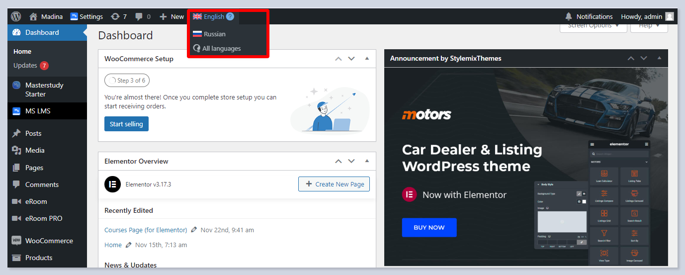 After a successful setup, a drop-down list of the selected languages will appear in the area of your dashboard.
