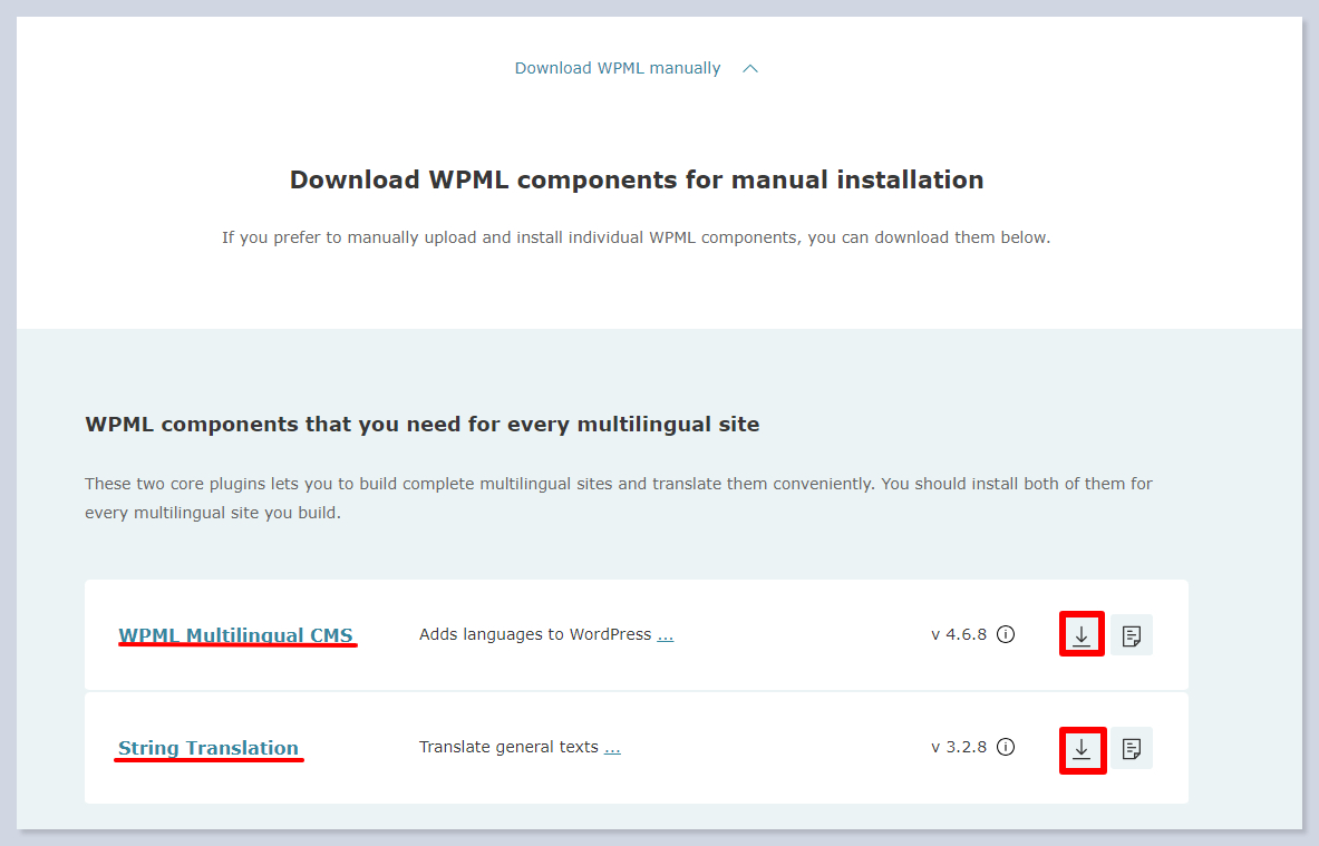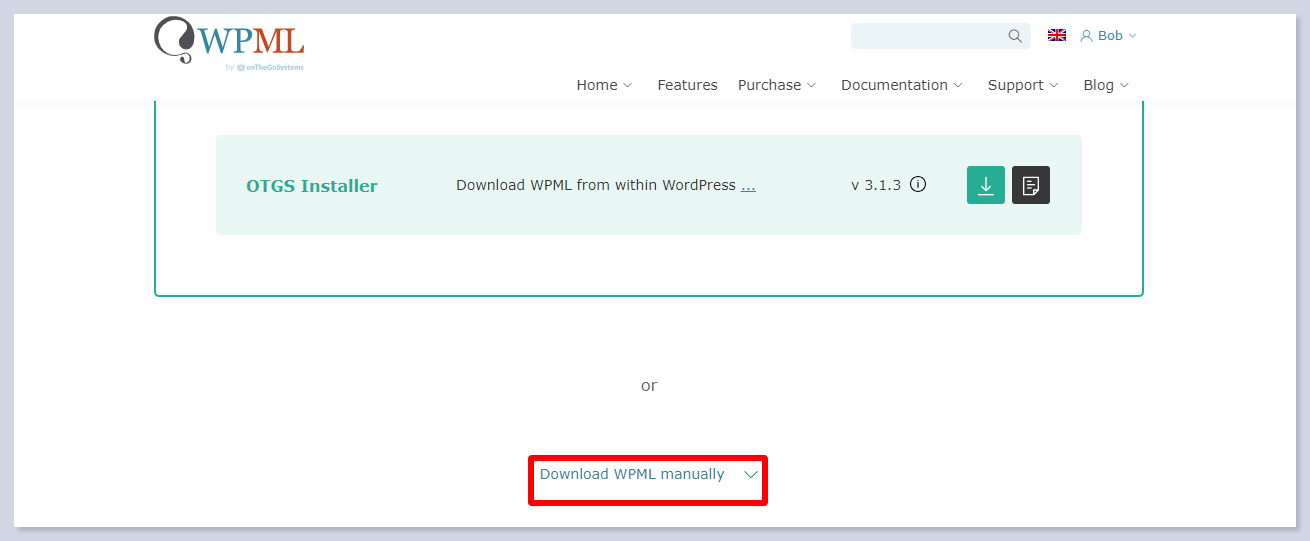 3. Scroll down the page until you find the Download WPML manually button and click on the **Download WPML manually** button.