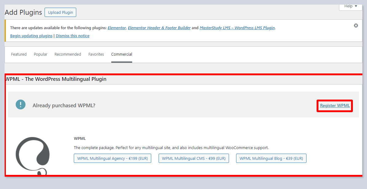 Find the **WPML Multilingual CMS** and click on **Register.**