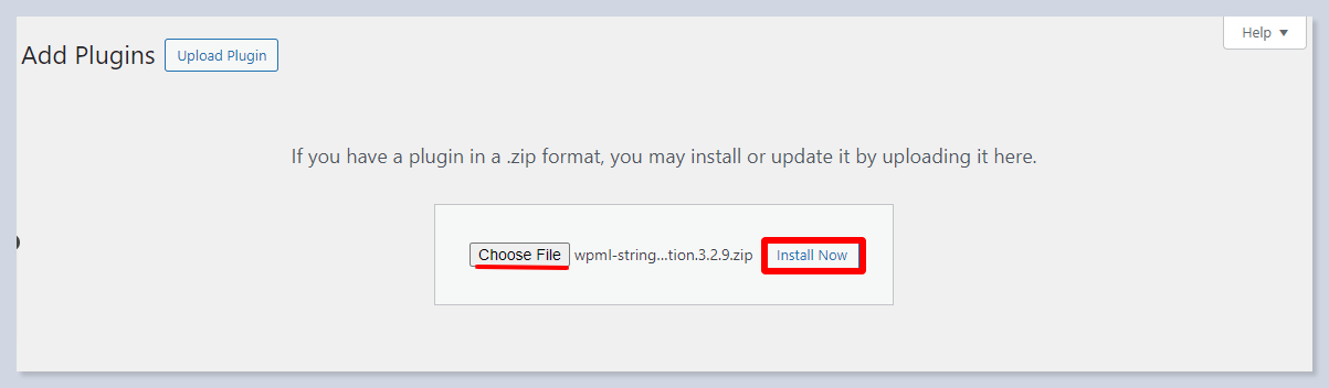 Then click on the "**Choose file**" and choose the file WPML Multilingual CMS you downloaded.&#x20;