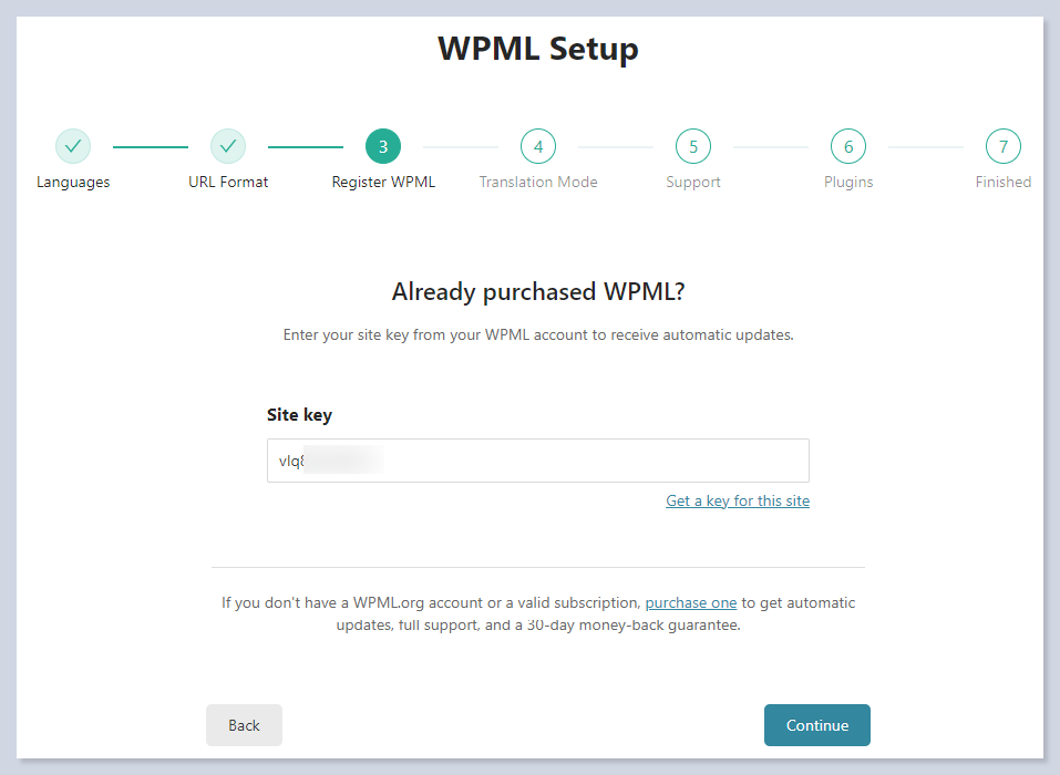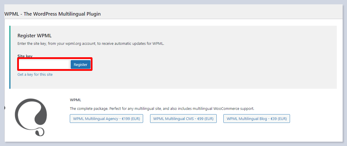 In the open page, enter the Site Key from [WPML ](https://wpml.org/account/sites/)you copied earlier and register.