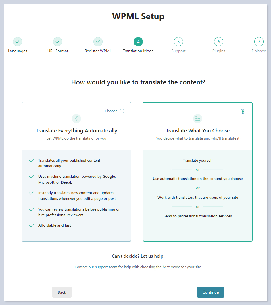 In the fourth step, choose "Translate What You Choose" for translation mode and click **Continue**.