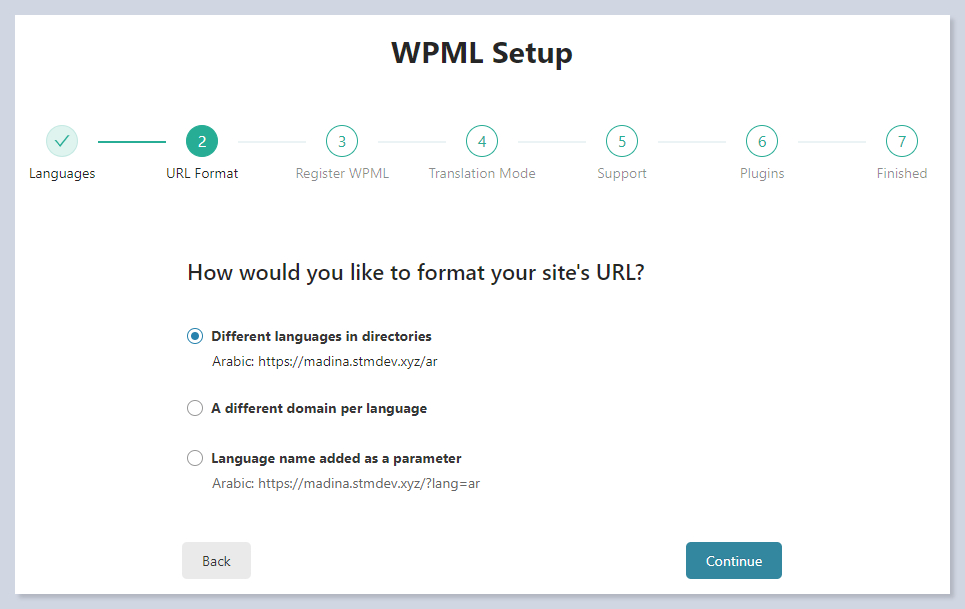 You can choose the format you want when setting up WPML for the first time. If you would like to change it to a different format after setting up WPML, you can do so by going to **WPML > Languages** and scrolling to the **Language URL format**.