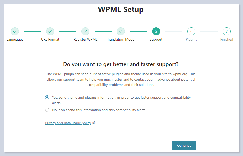 In the fifth step, select **Yes** to get support and click **Continue**.