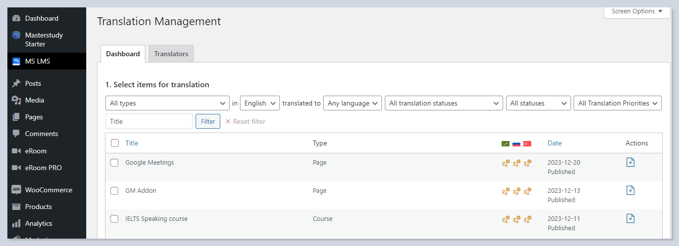 Now, that you have set up the WPML plugin on your site and will be redirected to the Translation Management page.