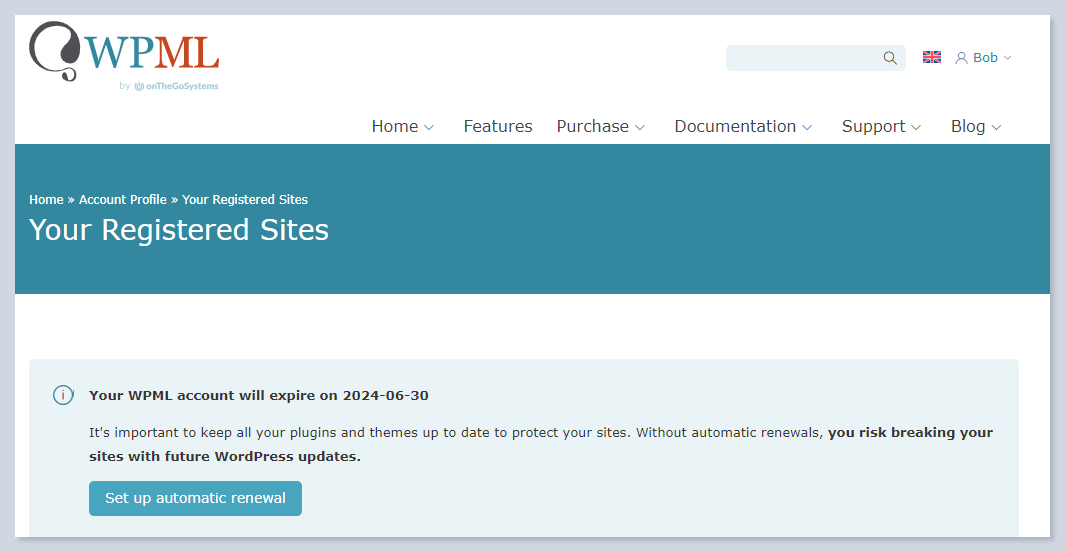 After uploading WPML for your website go to the [**Your Registered Sites**](https://wpml.org/account/sites/) **page.**