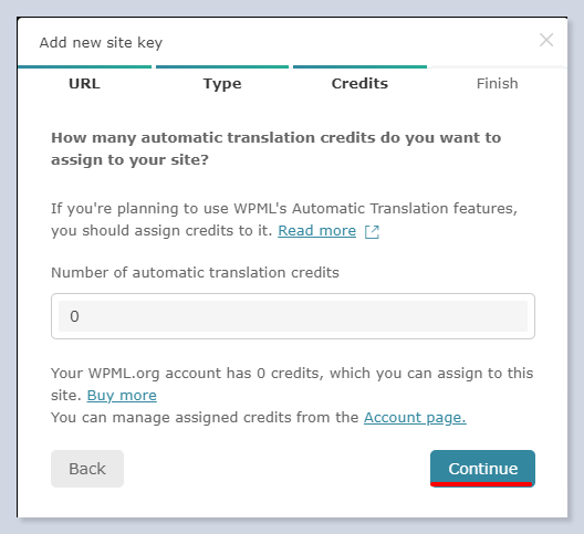 Then select the number of automatic translation credits by WPML you want to give to your site and click on the Continue button.
