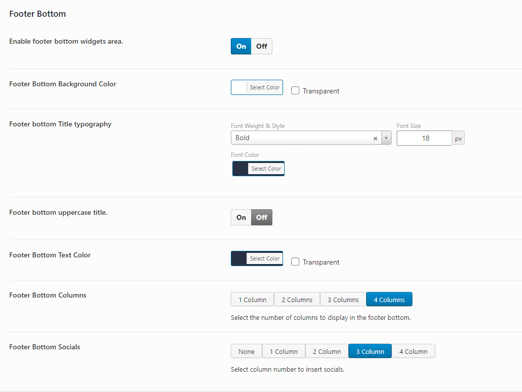 Here, the colors of the Background, Text, and Copyright Border can be changed. There is also a setting for the footer logo for copyright section and if it is enabled the section for image upload appears