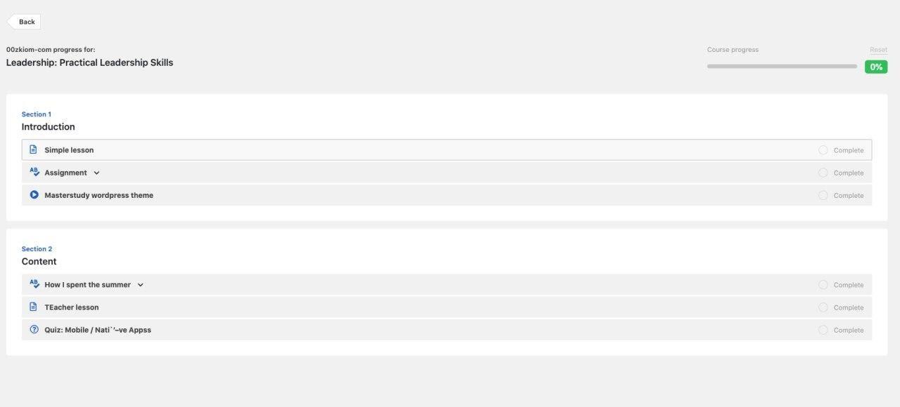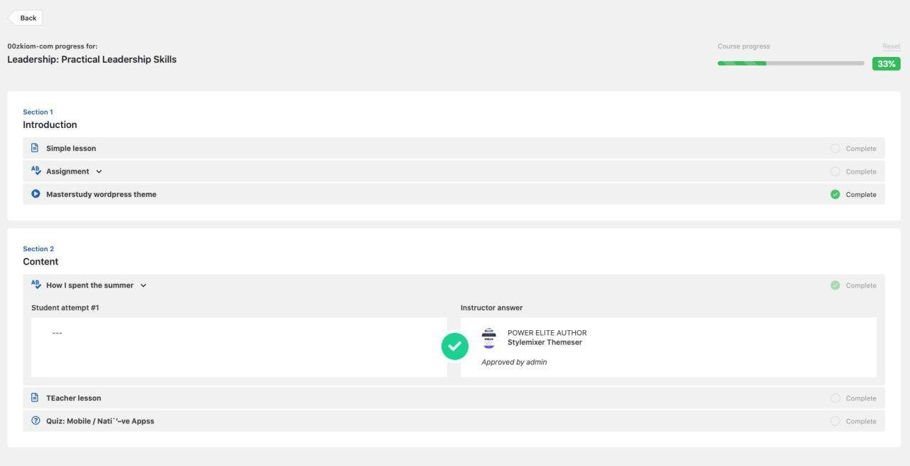 On this page, you can check the performance of a student more precisely and see the completed lessons and tasks. In addition to this, you can reset the results and mark, for example, a complete lesson as unfinished (just uncheck the item).