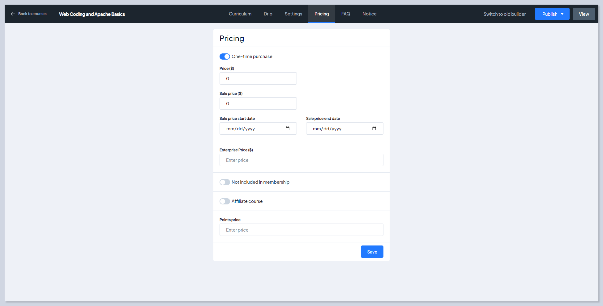 One-time purchase - Enable One-time purchases to make the course available for purchase not only through the membership plans. Enter the number in the blank to set the course price, or leave the field empty to make the course free.