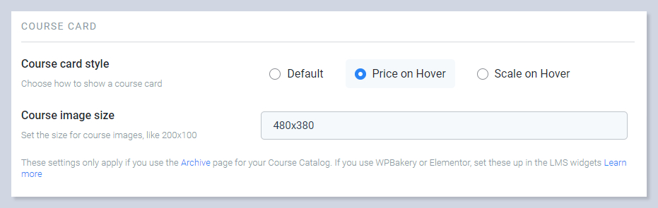 From version 3.0.24 of the MasterStudy LMS plugin, these settings apply only to the Archive page of courses. WPBakery and Elementor users can now configure course card settings directly within **LMS widgets**. You can customize and change container heights and image sizes for cards.