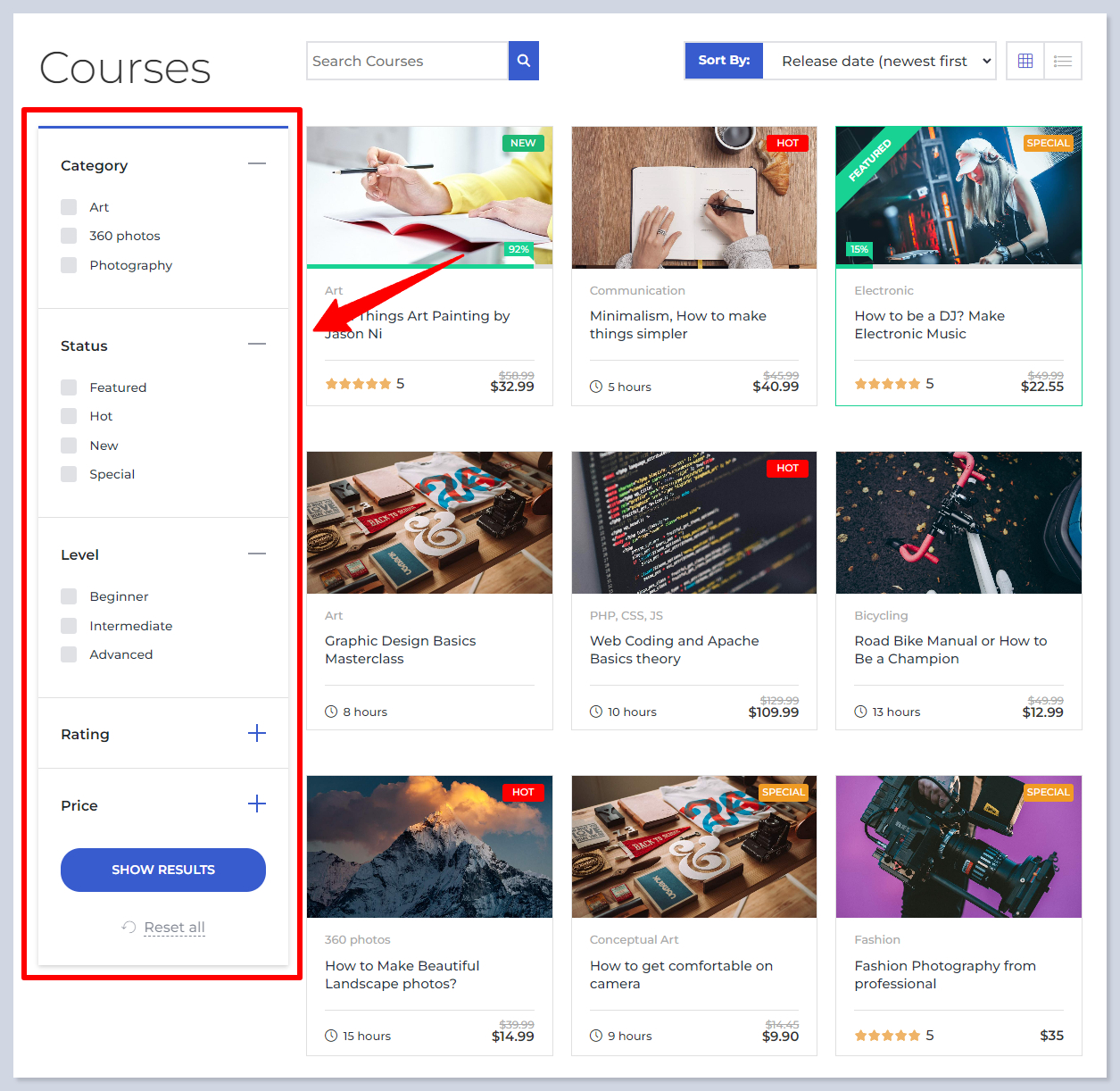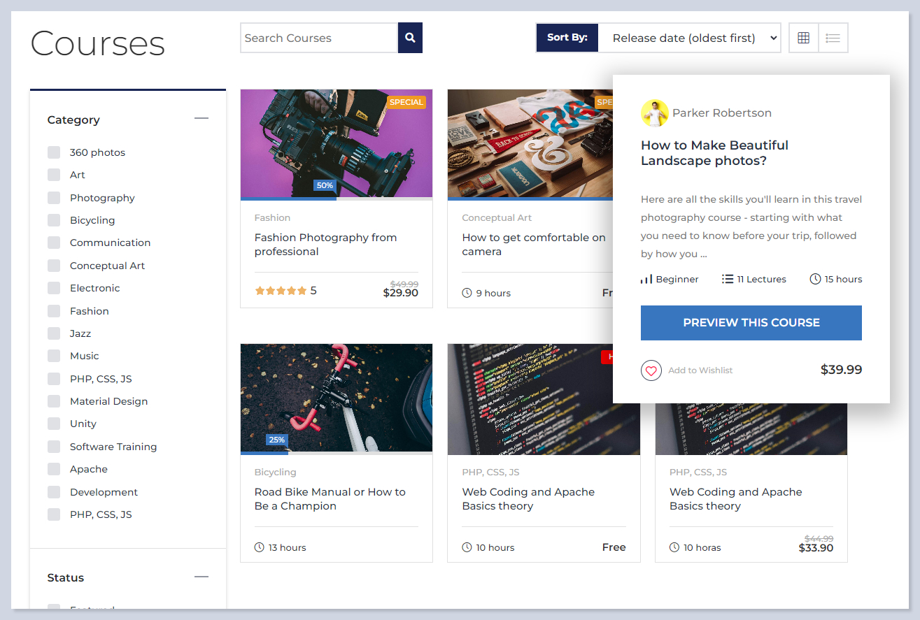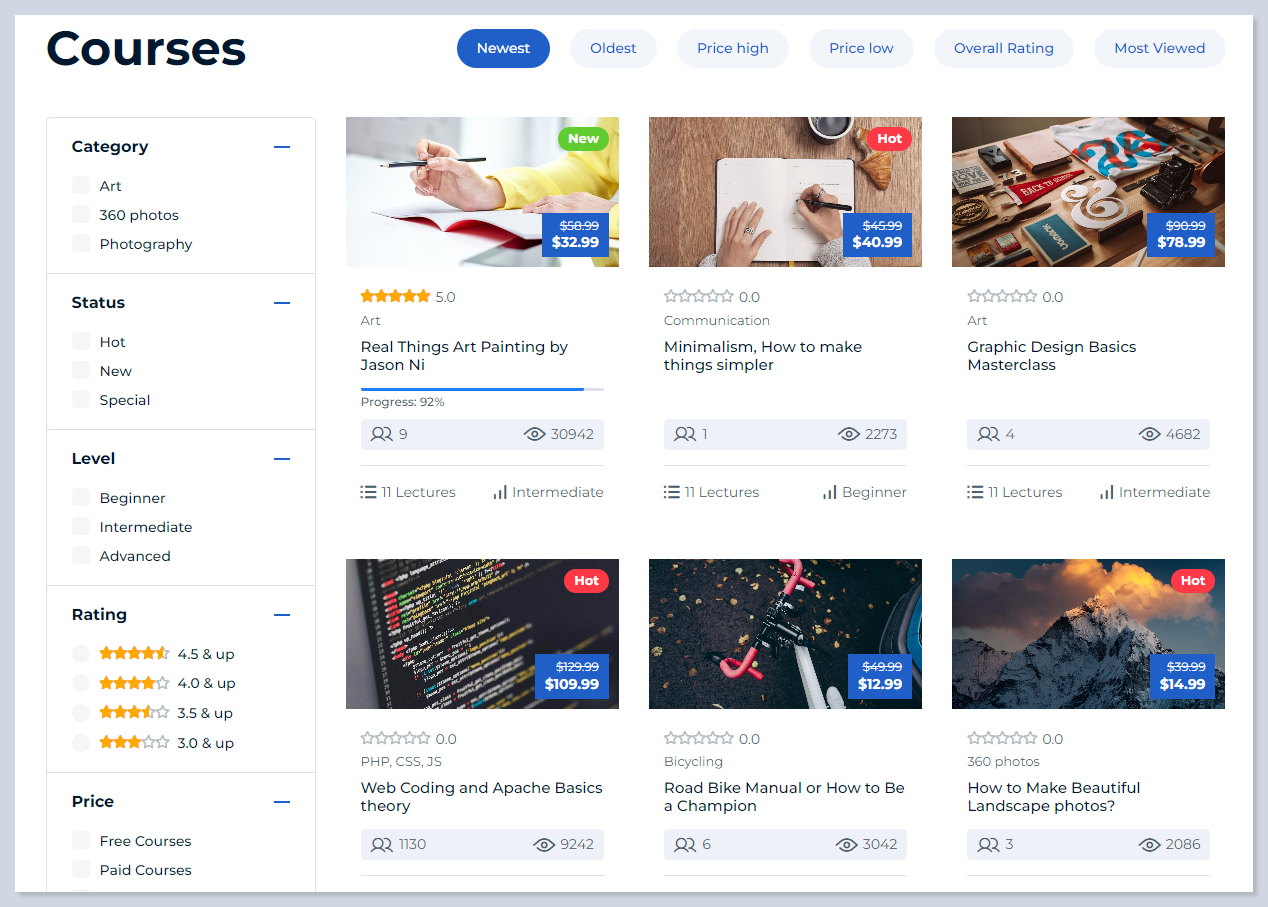 With these options, users can use the sidebar on the course listing page and filter the browsing depending on the chosen category. Every time they apply the filter they do not need to reload the page, every change displays instantly.