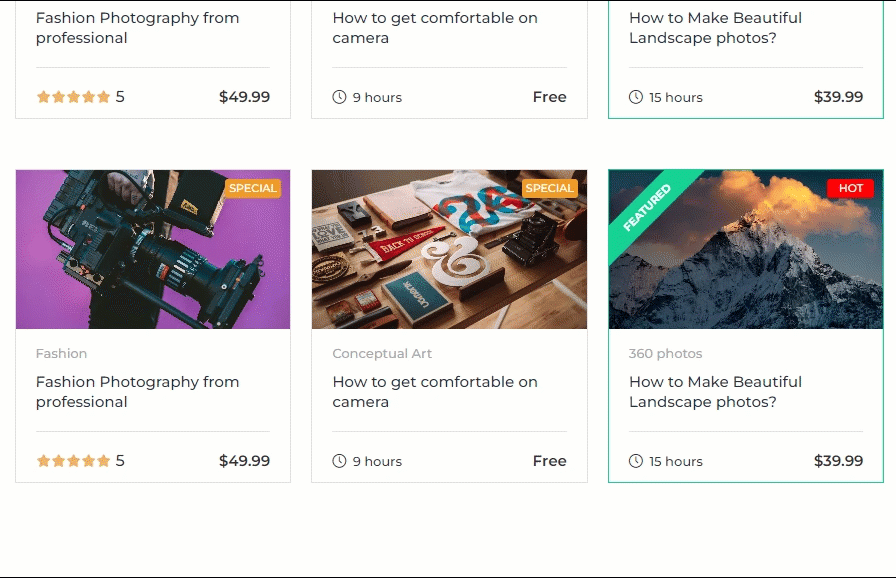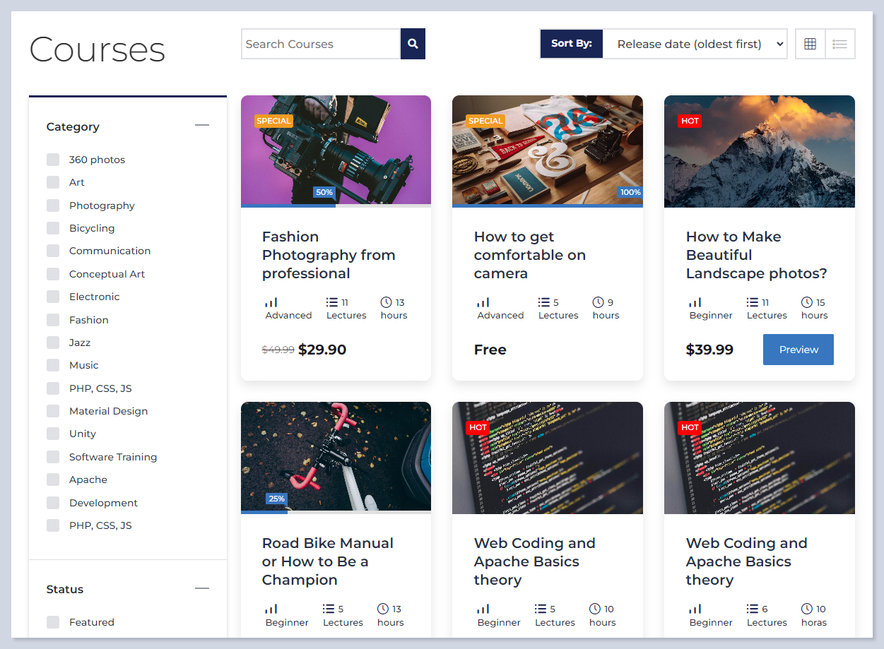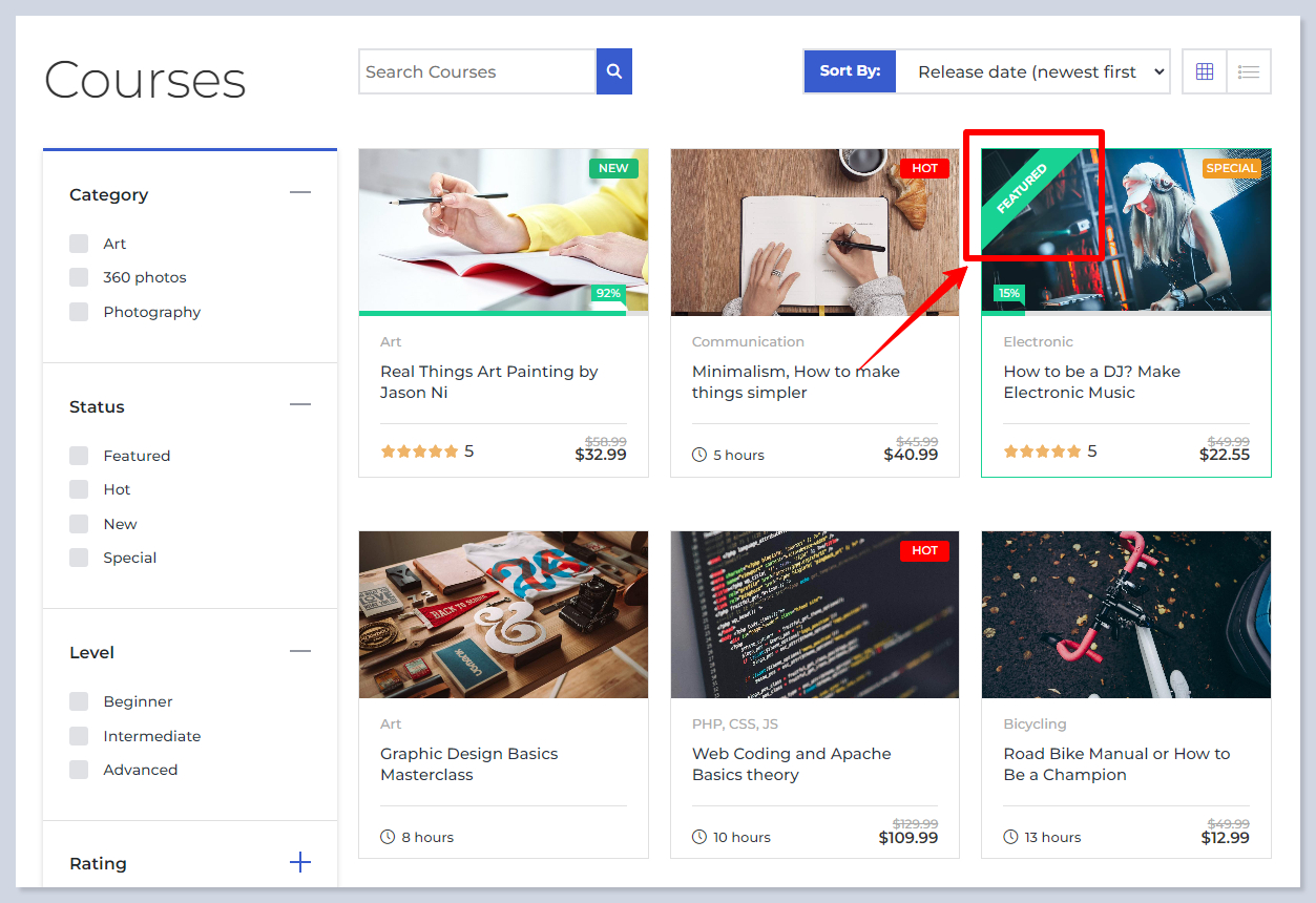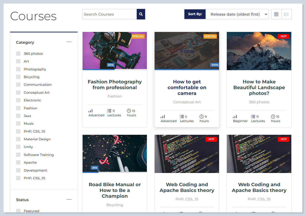 With these options, users can use the sidebar on the course listing page and filter the browsing depending on the chosen category. Every time they apply the filter they do not need to reload the page, every change displays instantly.