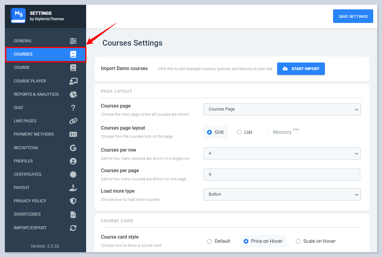 Here's an overview of the settings you can manage under the **MasterStudy LMS Settings** **> Courses** tab: