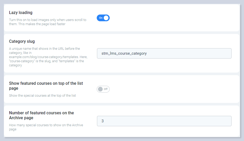 * **Number of featured courses on the Archive page** - Specify the number of featured courses to display on the **Archive Page**