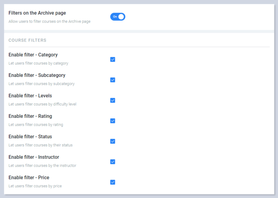 * **Filters on the Archive page** - Enable course filtering by categories, there are 7 filters available that you can enable according to your needs. Available options are: