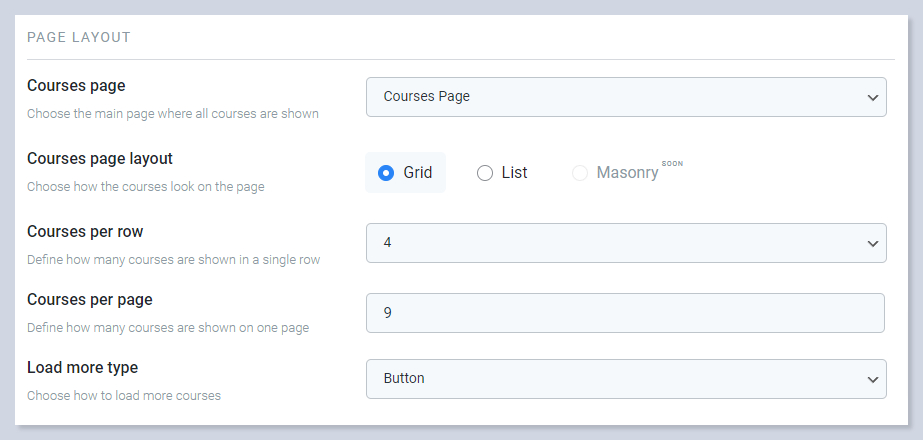 * **Courses Page Layout** - Choose the layout for the courses page: **Grid** or **List.**