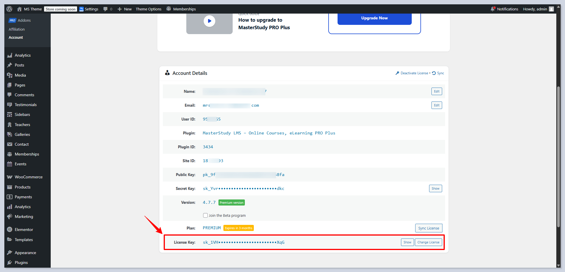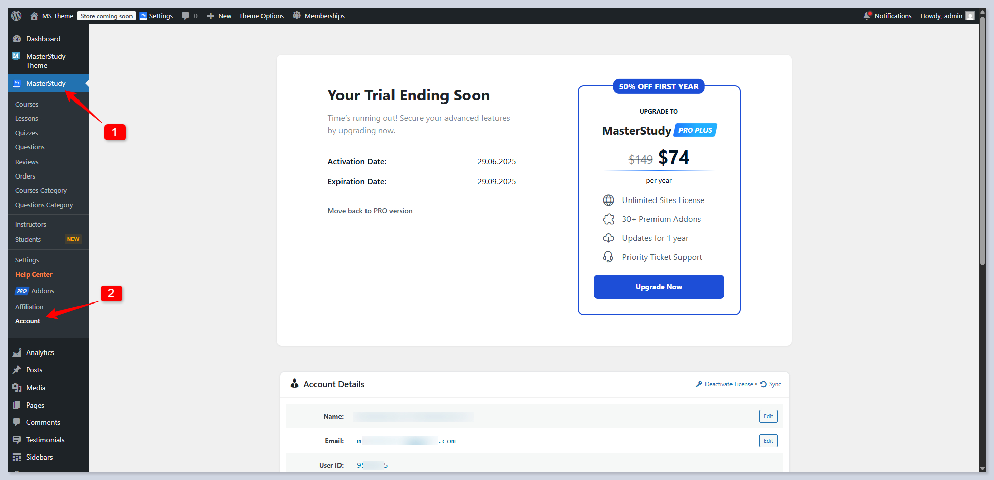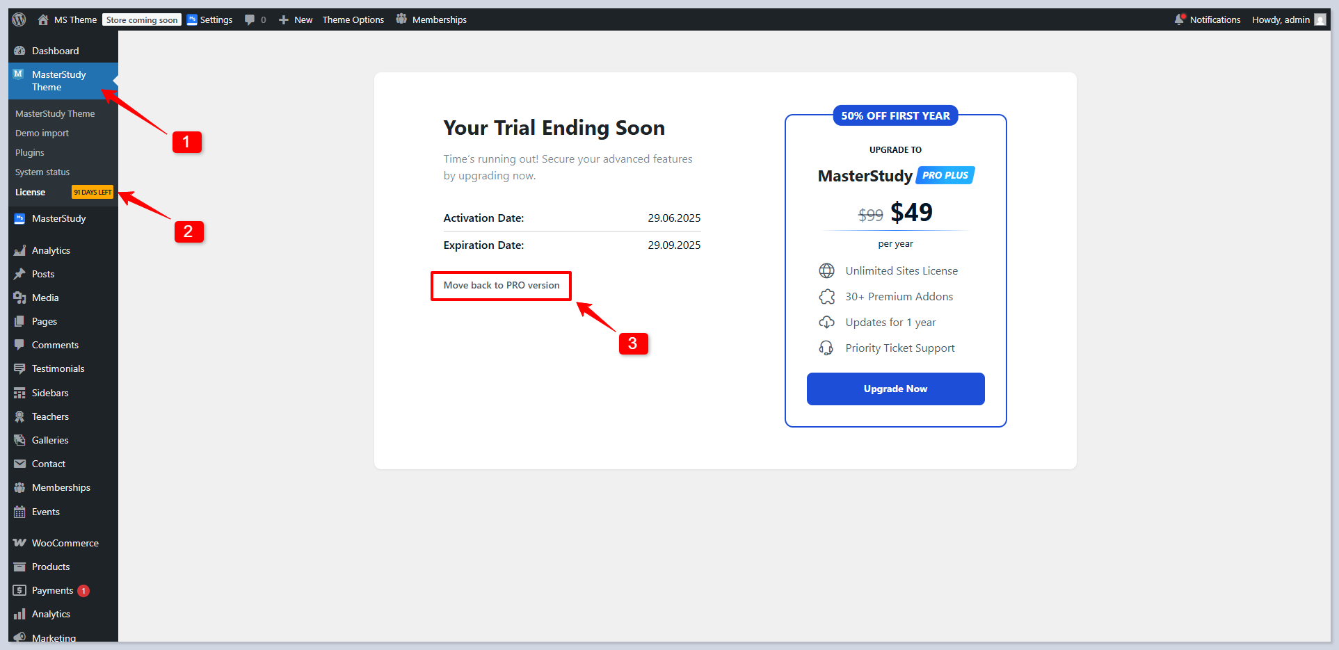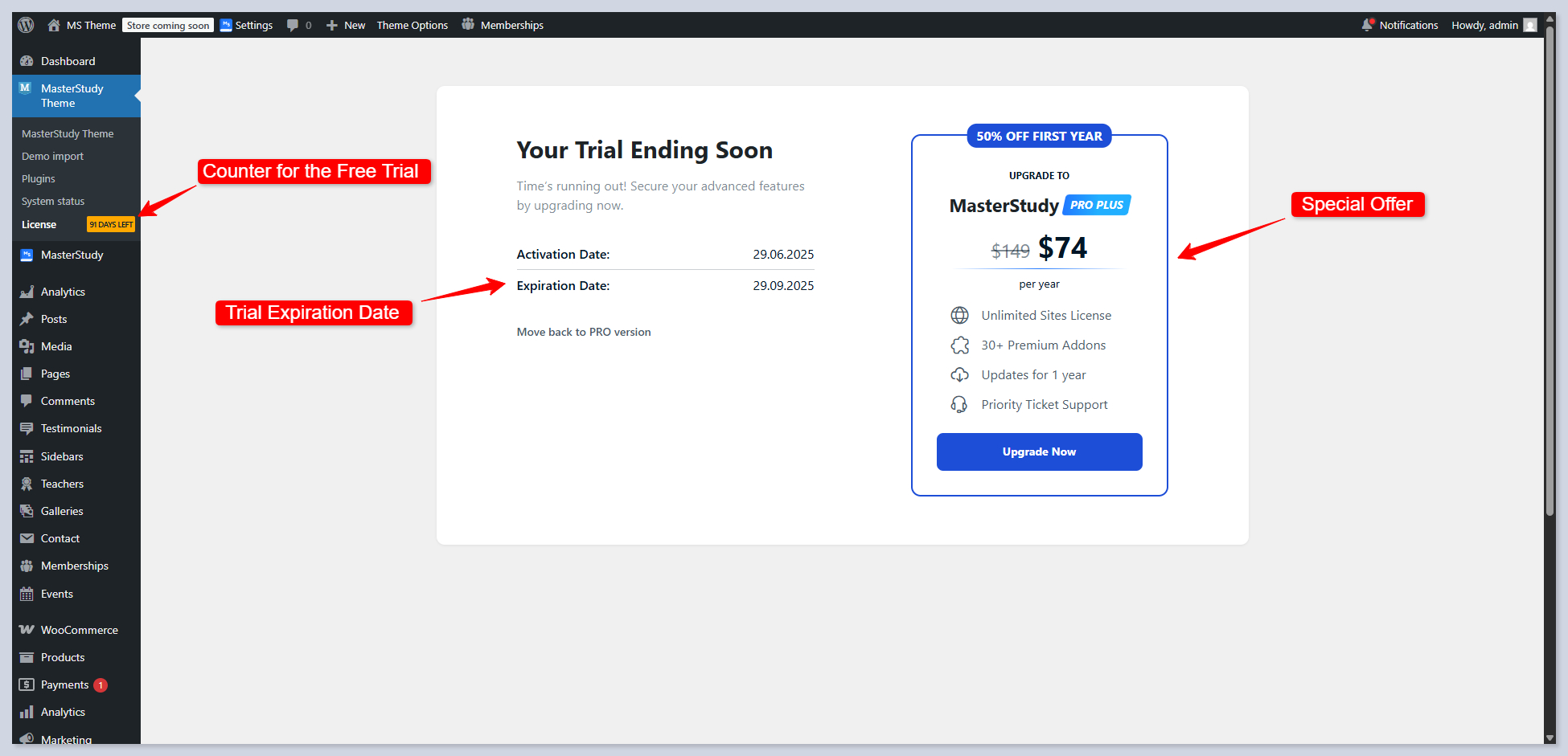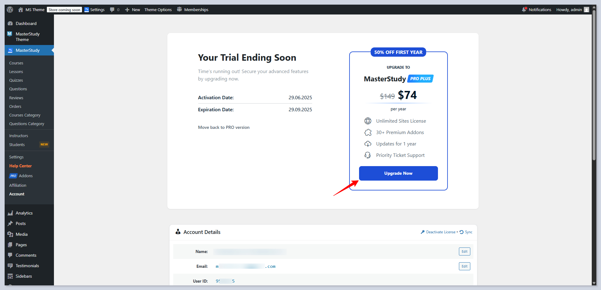 That’s it, you now have access to the **MasterStudy Pro Plus version**. To see how many days are left in your free trial, you can always follow **WP Dashboard > MS Theme > License tab.**