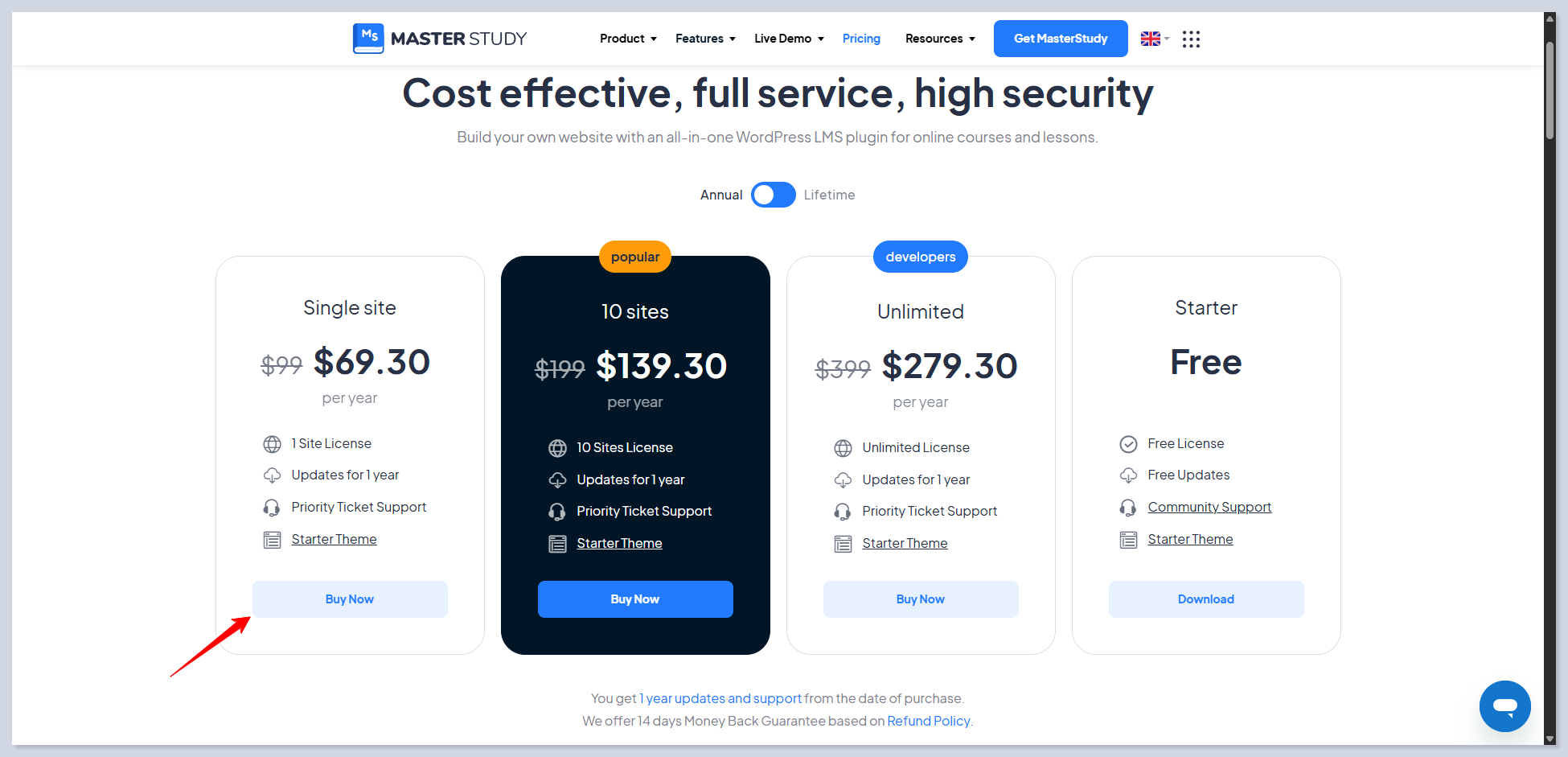 It brings you to the Pricing page of MasterStudy LMS. Pick the plan you want and click on <kbd>Buy Now</kbd>: