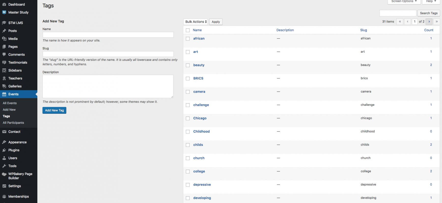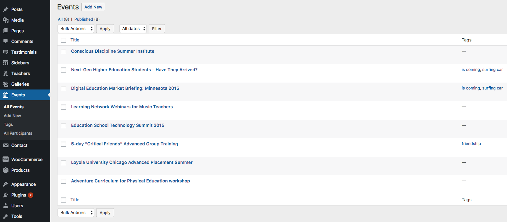 Events are created as another custom post type called Gallery. You can see all your Events under the Dashboard > Events menu on your Admin menu.