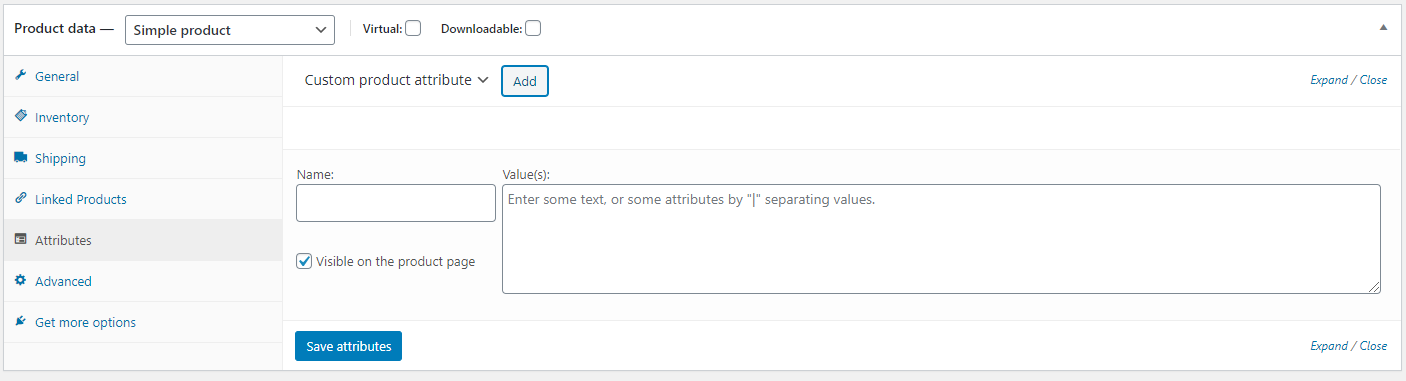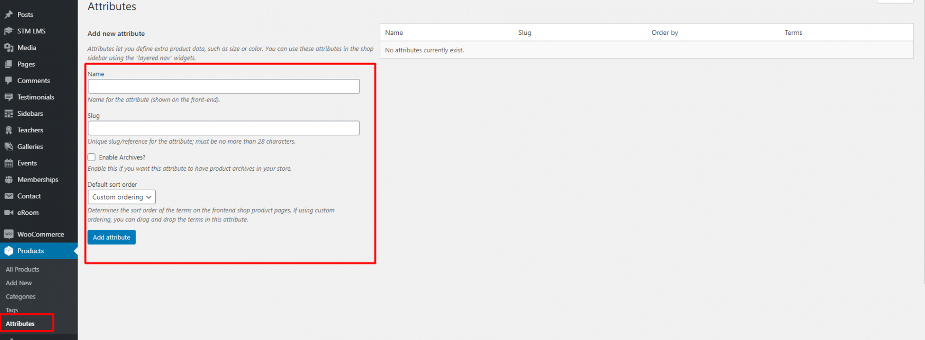 You can also add a new attribute in Products > Attribute. Enter the name and slug and click Add attribute.