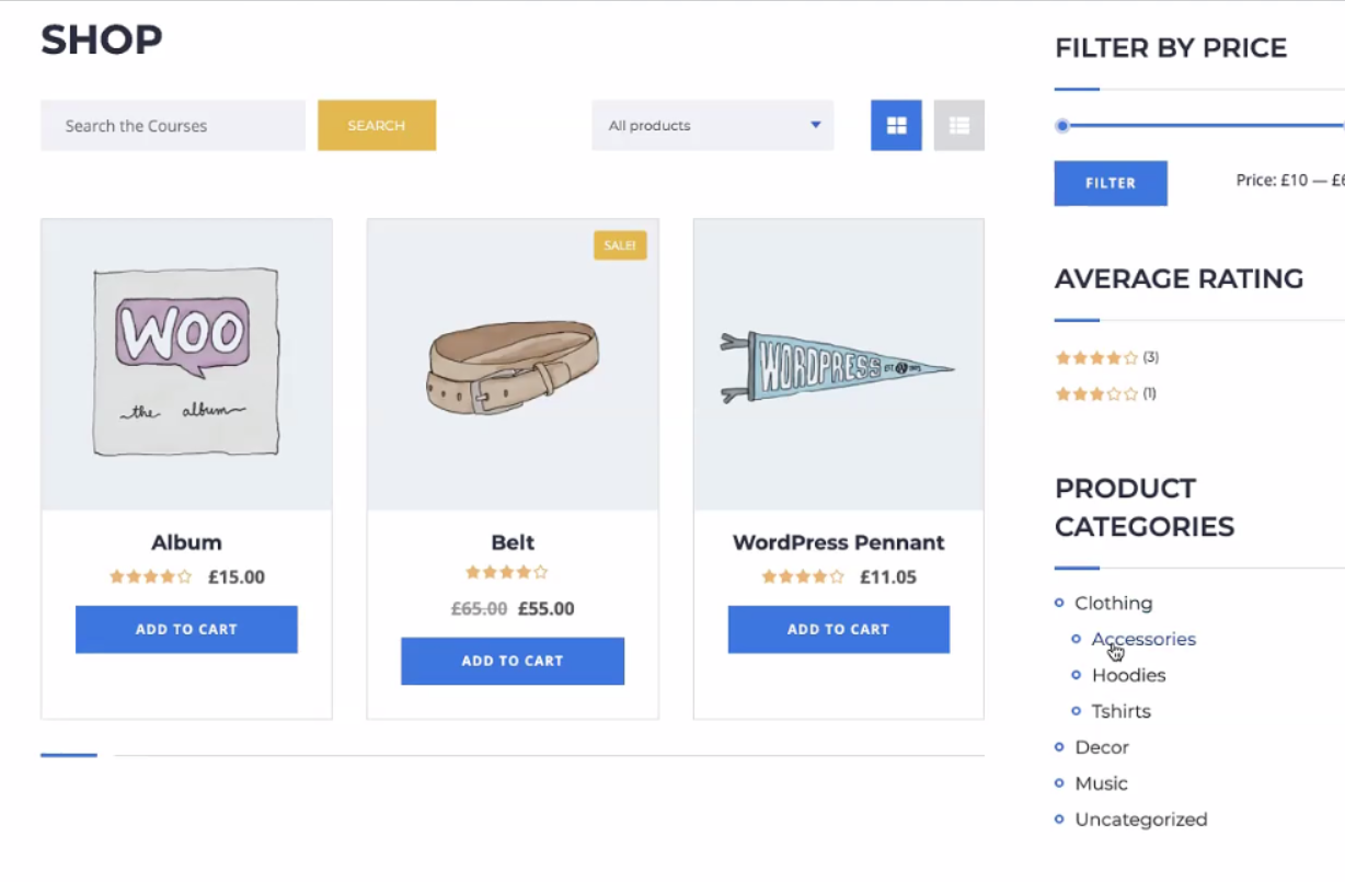On the Shop page, you can add the sidebar with filters to help users navigate and manage the display of the products.