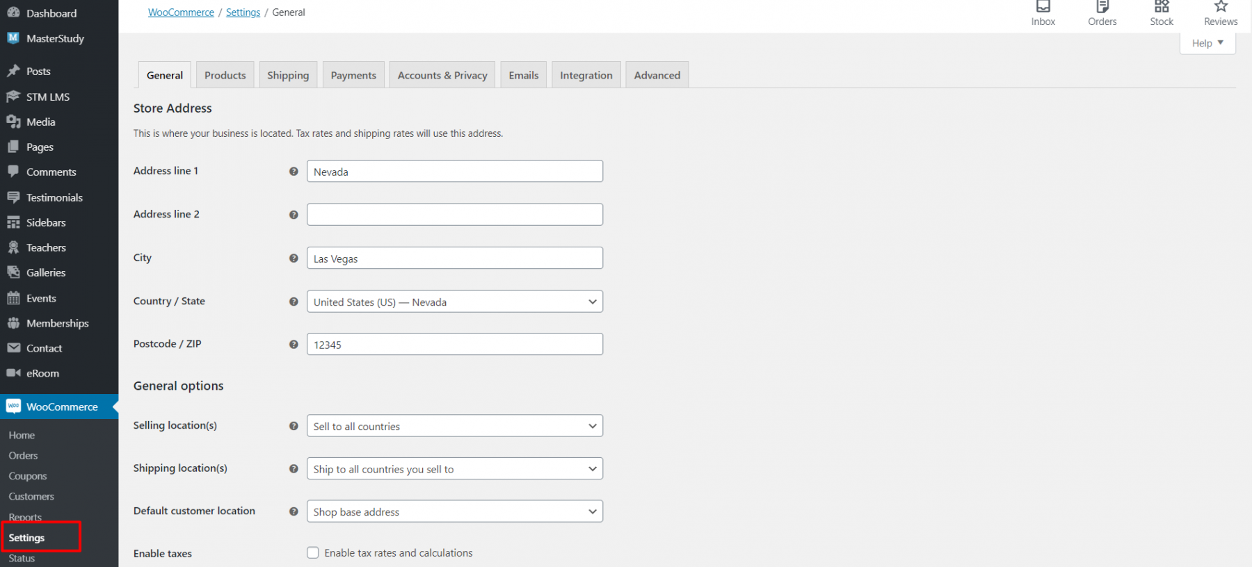 Go to WooCommerce > Settings and set up basic things. The settings page includes different sections that you can switch using the tabs: General, Products, Shipping, Payments, Accounts & Privacy, Emails, Integration, Advanced.
