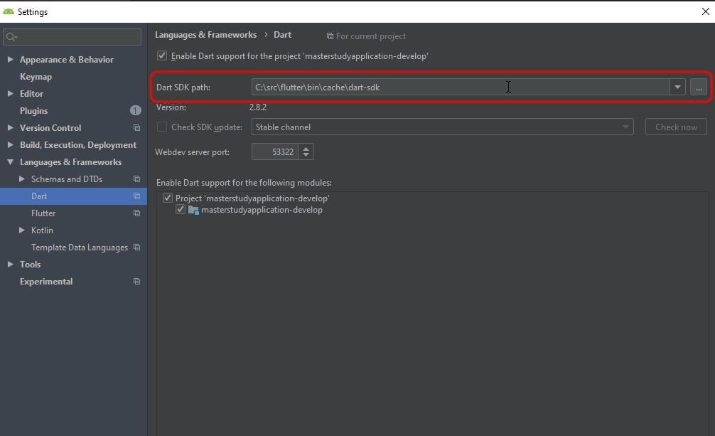 After this step, follow to Settings > Languages & Frameworks > Dart to set up Dart SDK.