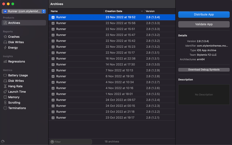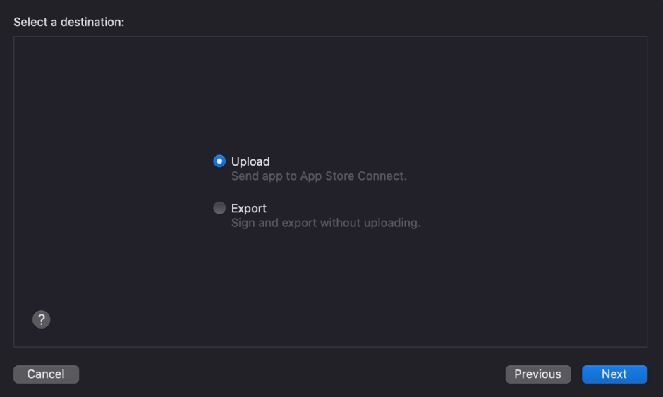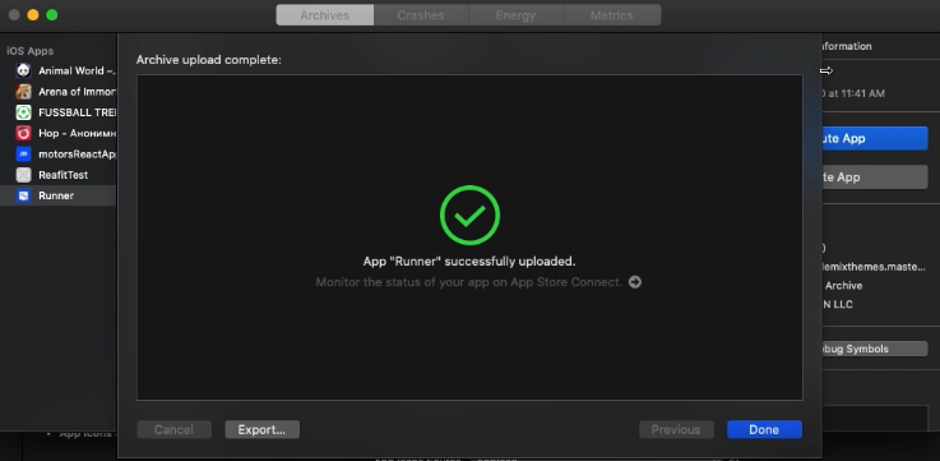 Alternatively, to export the app before uploading it, click Export, then click Next. Select a location for the files, then click Export. A folder containing the archive export files appears in Finder.