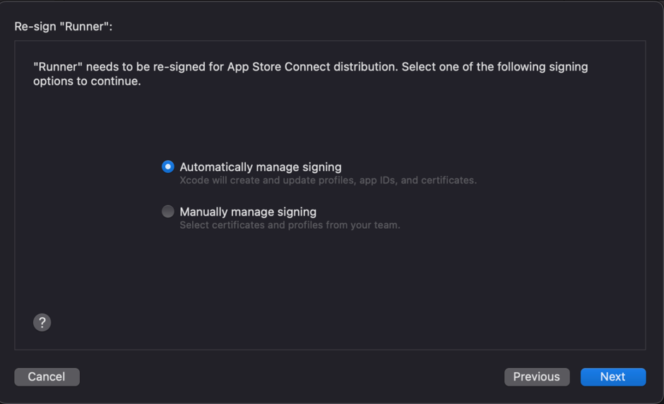Tip: If you select “Manually manage signing” option, follow alternate steps of the Manually manage distribution signing tutorial.