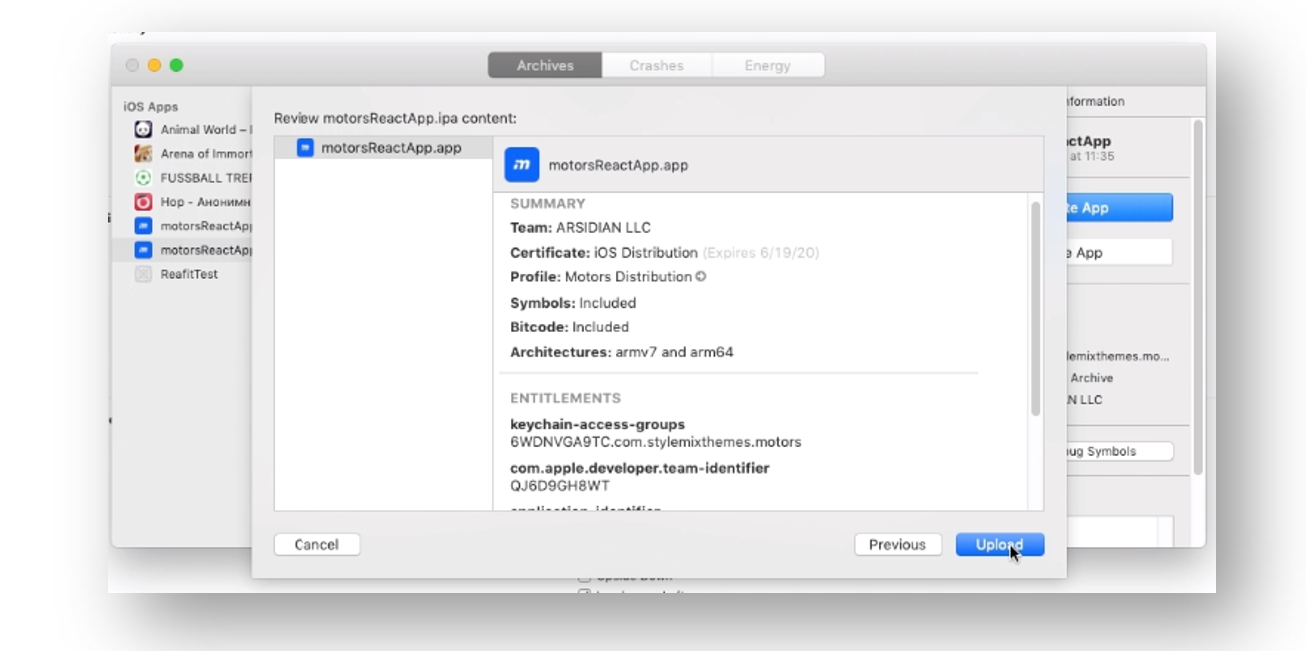 Click Upload to run uploading process of your app to the App Store