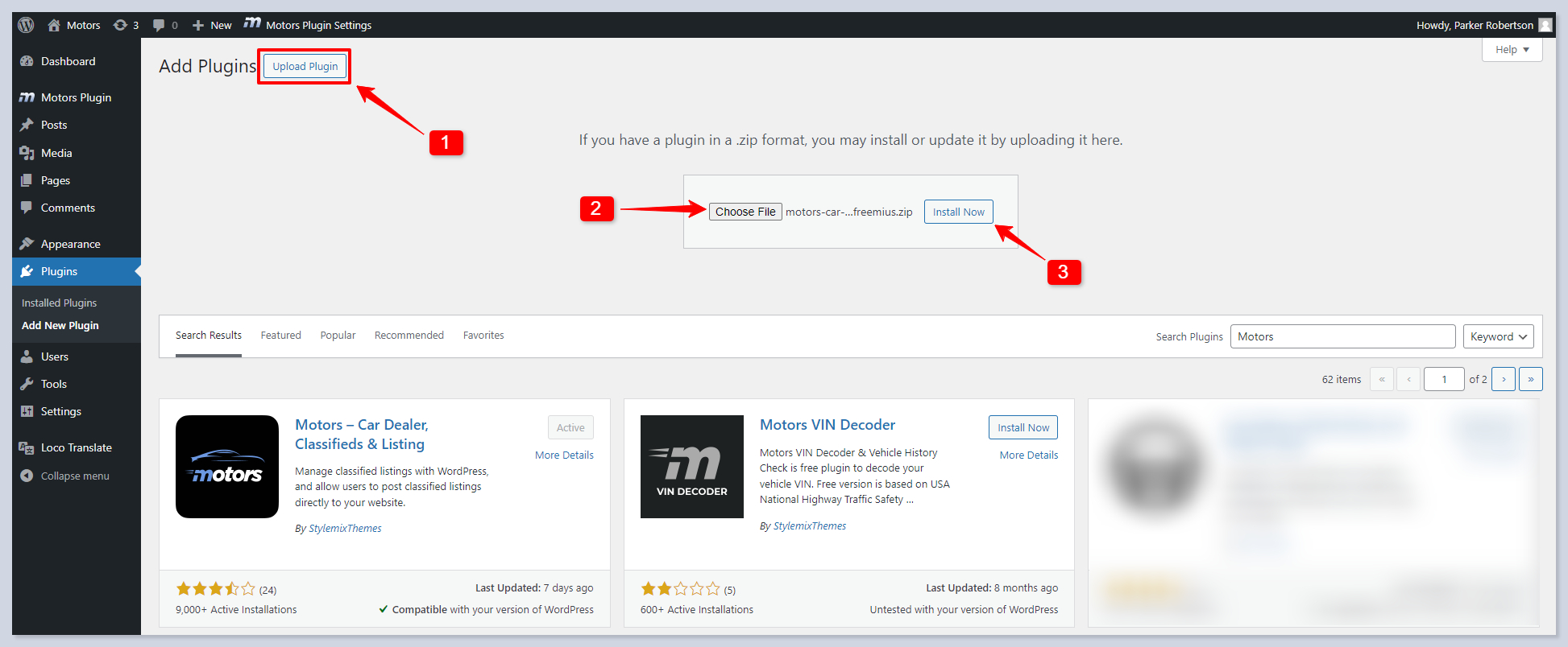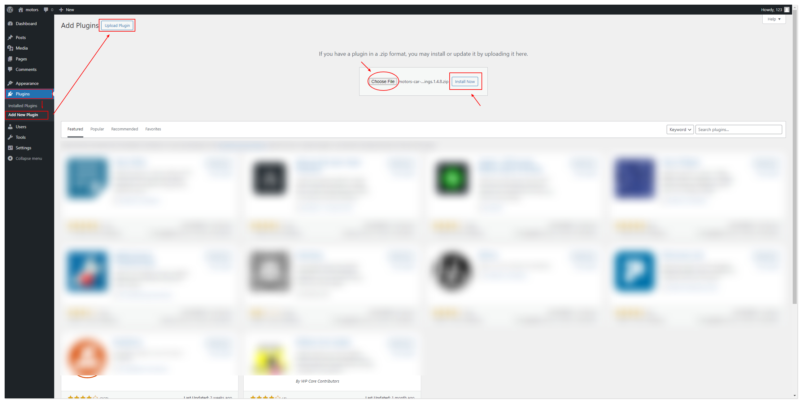 <figure><img src="https://3691894799-files.gitbook.io/~/files/v0/b/gitbook-x-prod.appspot.com/o/spaces%2FhdEQqDAl80vVzOxJm8Us%2Fuploads%2FcyrGqhwK1jMezWeOM6jp%2FUpload-Plugins-%E2%80%B9-motors-%E2%80%94-WordPress.jpg?alt=media&#x26;token=7333a0f3-ea13-4c11-b4fa-4cc38474c31b" alt=""><figcaption><p>Upload Plugin</p></figcaption></figure>