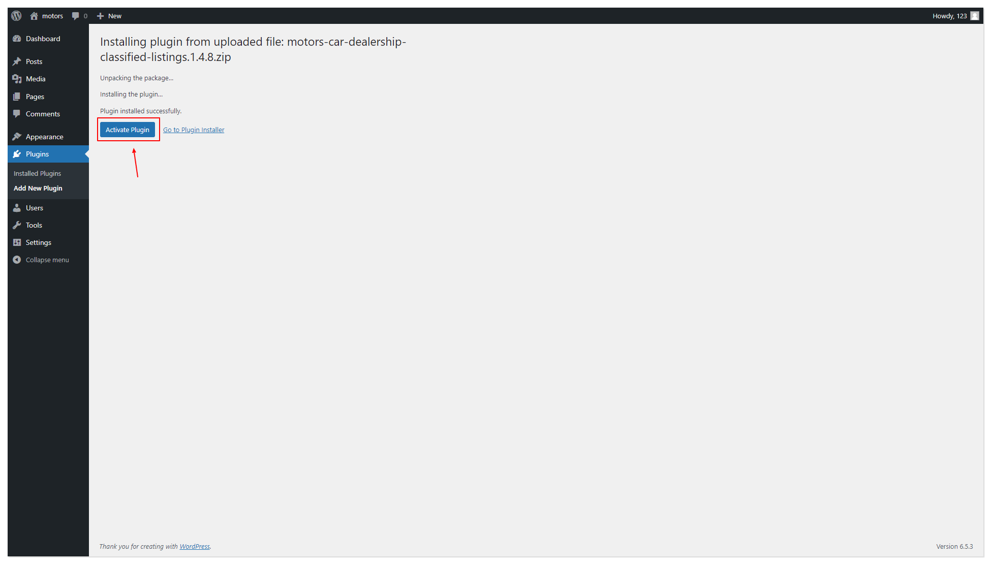 <figure><img src="https://3691894799-files.gitbook.io/~/files/v0/b/gitbook-x-prod.appspot.com/o/spaces%2FhdEQqDAl80vVzOxJm8Us%2Fuploads%2FJjygaknmZmEzTouEIJxr%2FActivate-Plugin-%E2%80%B9-motors-upload%E2%80%94-WordPress.jpg?alt=media&#x26;token=129876ae-d670-4f68-af47-5d26e2dfeeff" alt=""><figcaption><p>Activate Plugin</p></figcaption></figure>
