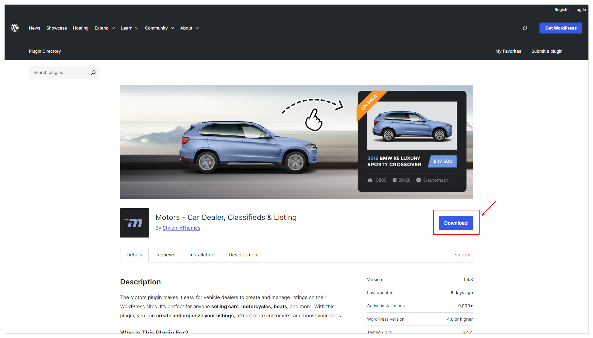 <figure><img src="https://3691894799-files.gitbook.io/~/files/v0/b/gitbook-x-prod.appspot.com/o/spaces%2FhdEQqDAl80vVzOxJm8Us%2Fuploads%2FQ5IKBDe4V4rFDHOIxcbJ%2FMotors-%E2%80%93-Car-Dealer-Classifieds-Listing-%E2%80%93-WordPress-plugin-WordPress-org-download.jpg?alt=media&#x26;token=f8ed37b9-2ab7-4f8a-8d15-b905383f8370" alt=""><figcaption><p>Download Plugin</p></figcaption></figure>