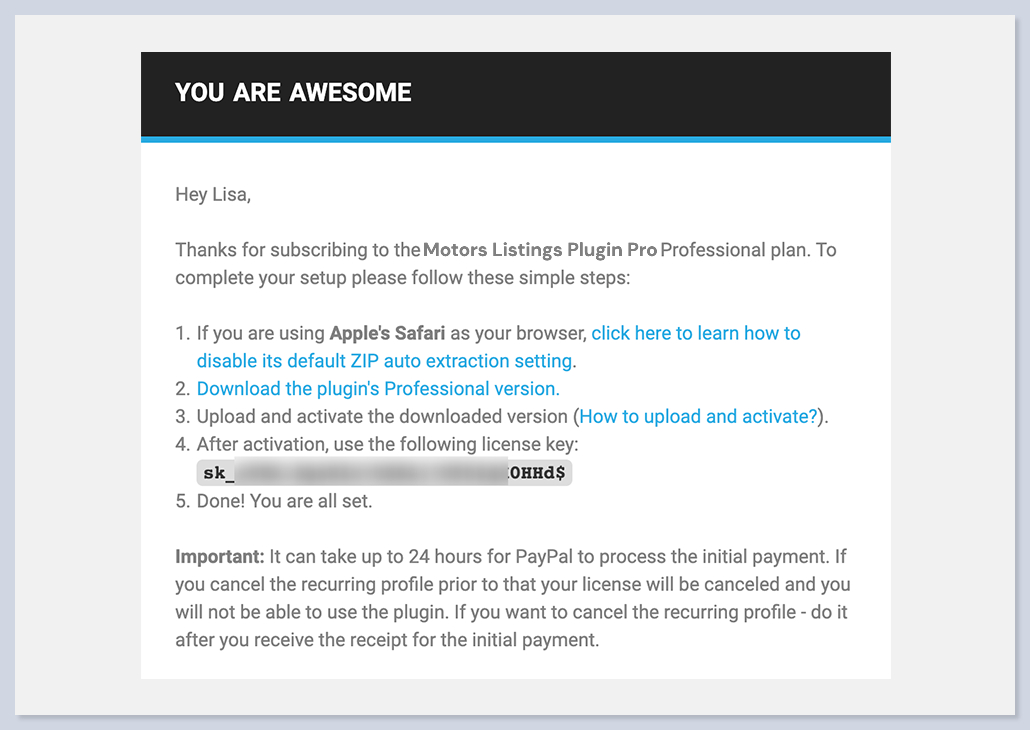 1. When all your data is found to be correct about your buying, you will get a welcome message by **Freemius**, sent to your email. In that message, you will be aware of linking to Pro Plugin's download page with the license key to activate the plugin. You will also be informed of some personal data and instructions for activation.